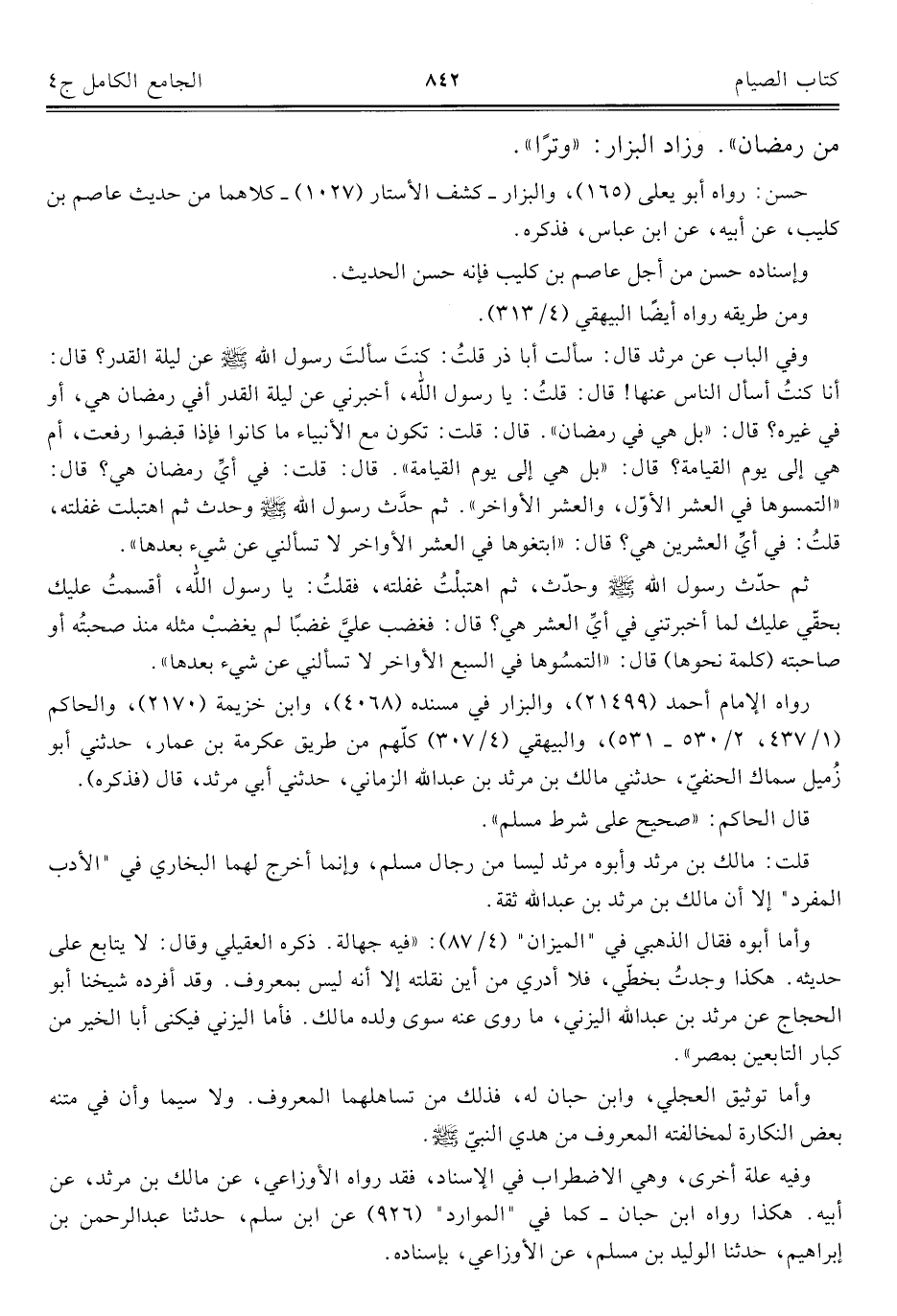 وفي الباب عن مرثد قال: سألت أبا ذر قلتُ: كنتَ سألتَ رسول الله - صلى الله عليه وسلم - عن ليلة القدر؟ قال: أنا كنتُ أسأل الناس عنها! قال: قلتُ: يا رسول الله، أخبرني عن ليلة القدر أفي رمضان هي، أو في غيره؟ قال: "بل هي في رمضان". قال: قلت: تكون مع الأنبياء ما كانوا فإذا قبضوا رفعت، أم هي إلى يوم القيامة؟ قال: "بل هي إلى يوم القيامة". قال: قلت: في أيِّ رمضان هي؟ قال: "التمسوها في العشر الأوّل، والعشر الأواخر". ثم حدَّث رسول الله - صلى الله عليه وسلم - وحدث ثم اهتبلت غفلته، قلتُ: في أيِّ العشرين هي؟ قال: "ابتغوها في العشر الأواخر لا تسألني عن شيء بعدها".