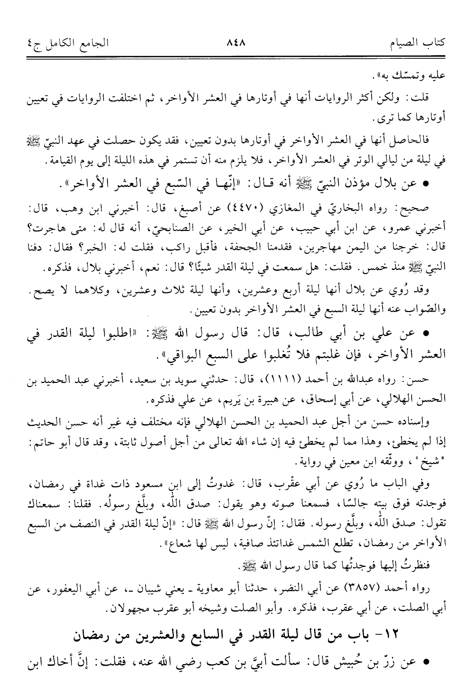وفي الباب ما رُوي عن أبي عقْرب، قال: غدوتُ إلى ابن مسعود ذات غداة في رمضان، فوجدته فوق بيته جالسًا، فسمعنا صوته وهو يقول: صدق الله، وبلَّغ رسولُه. فقلنا: سمعناك تقول: صدق الله، وبلَّغ رسوله. فقال: إنّ رسول الله - صلى الله عليه وسلم - قال: "إنّ ليلة القدر في النصف من السبع الأواخر من رمضان، تطلع الشمس غداتئذ صافية، ليس لها شعاع".