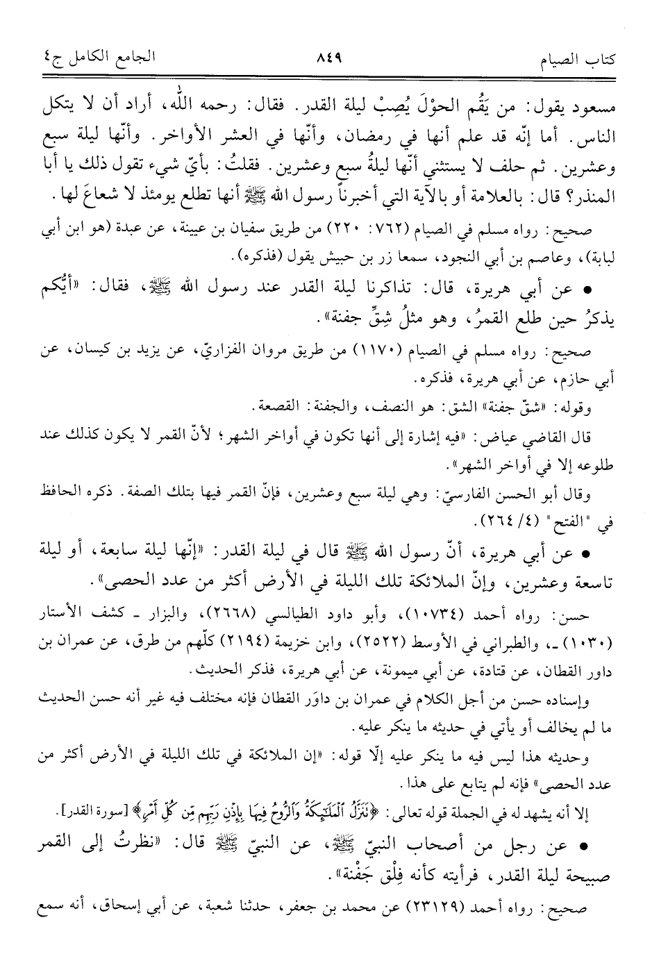 • عن رجل من أصحاب النبيّ - صلى الله عليه وسلم -، عن النبيّ - صلى الله عليه وسلم - قال: "نظرتُ إلى القمر صبيحة ليلة القدر، فرأيته كأنه فِلْق جَفْنة".