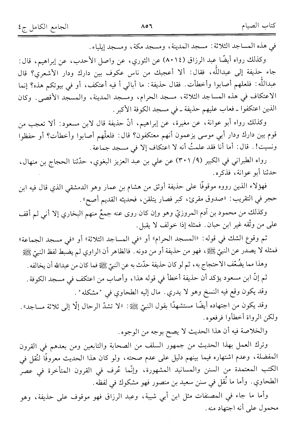 وكذلك رواه أيضًا عبد الرزاق (٨٠١٤) عن الثوري، عن واصل الأحدب، عن إبراهيم، قال: جاء حذيفة إلى عبد الله، فقال: ألا أعجبك من ناس عكوف بين دارك ودار الأشعري؟ قال عبد الله: فلعلهم أصابوا وأخطأت. فقال حذيفة: ما أبالي أفيه أعتكف، أو في بيوتكم هذه؟ إنما الاعتكاف في هذه المساجد الثلاثة، مسجد الحرام، ومسجد المدينة، والمسجد الأقصى. وكان الذين اعتكفوا -فعاب عليهم حذيفة- في مسجد الكوفة الأكبر.