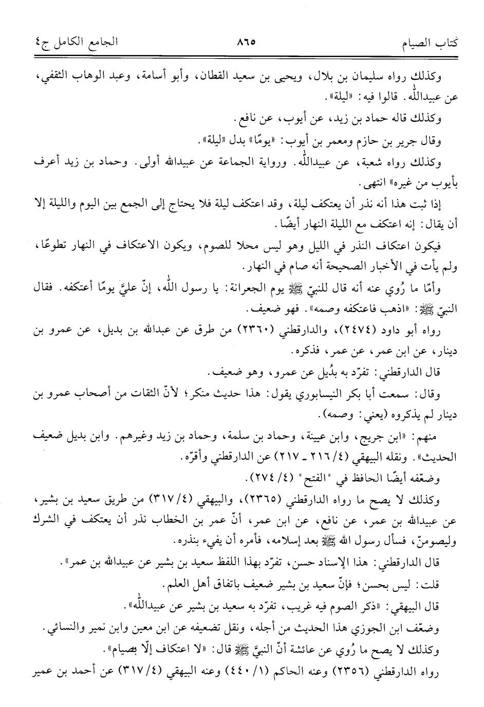 وأمّا ما رُوي عنه أنه قال للنبيّ - صلى الله عليه وسلم - يوم الجعرانة: يا رسول الله، إنّ عليَّ يومًا أعتكفه. فقال النبيّ - صلى الله عليه وسلم -: "اذهب فاعتكفه وصمه". فهو ضعيف.