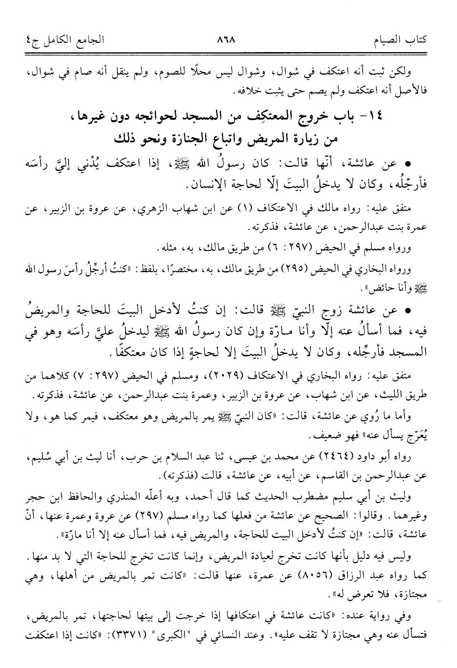 ١٤ - باب خروج المعتكف من المسجد لحوائجه دون غيرها، من زيارة المريض واتباع الجنازة ونحو ذلك