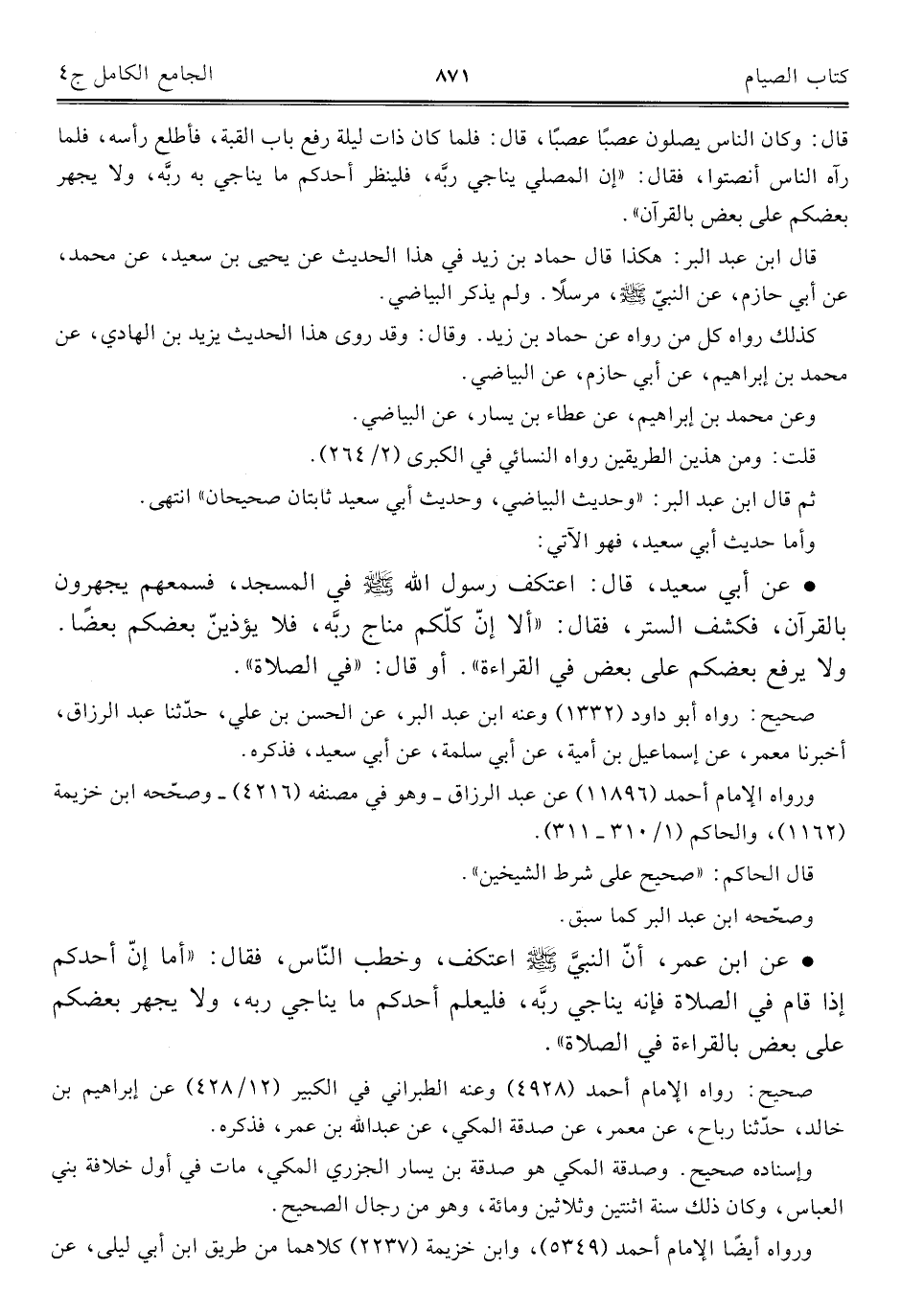 • عن أبي سعيد، قال: اعتكف رسول الله - صلى الله عليه وسلم - في المسجد، فسمعهم يجهرون بالقرآن، فكشف الستر، فقال: "ألا إنّ كلكم مناج ربَّه، فلا يؤذينّ بعضكم بعضًا. ولا يرفع بعضكم على بعض في القراءة". أو قال: "في الصلاة".