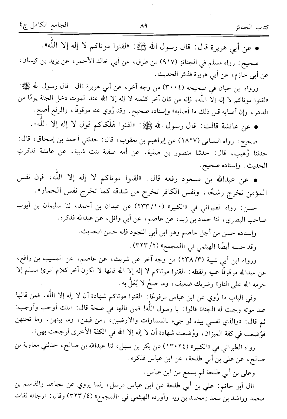 • عن أبي هريرة قال: قال رسول الله - صلى الله عليه وسلم -: "لقنوا موتاكم لا إله إلا الله".