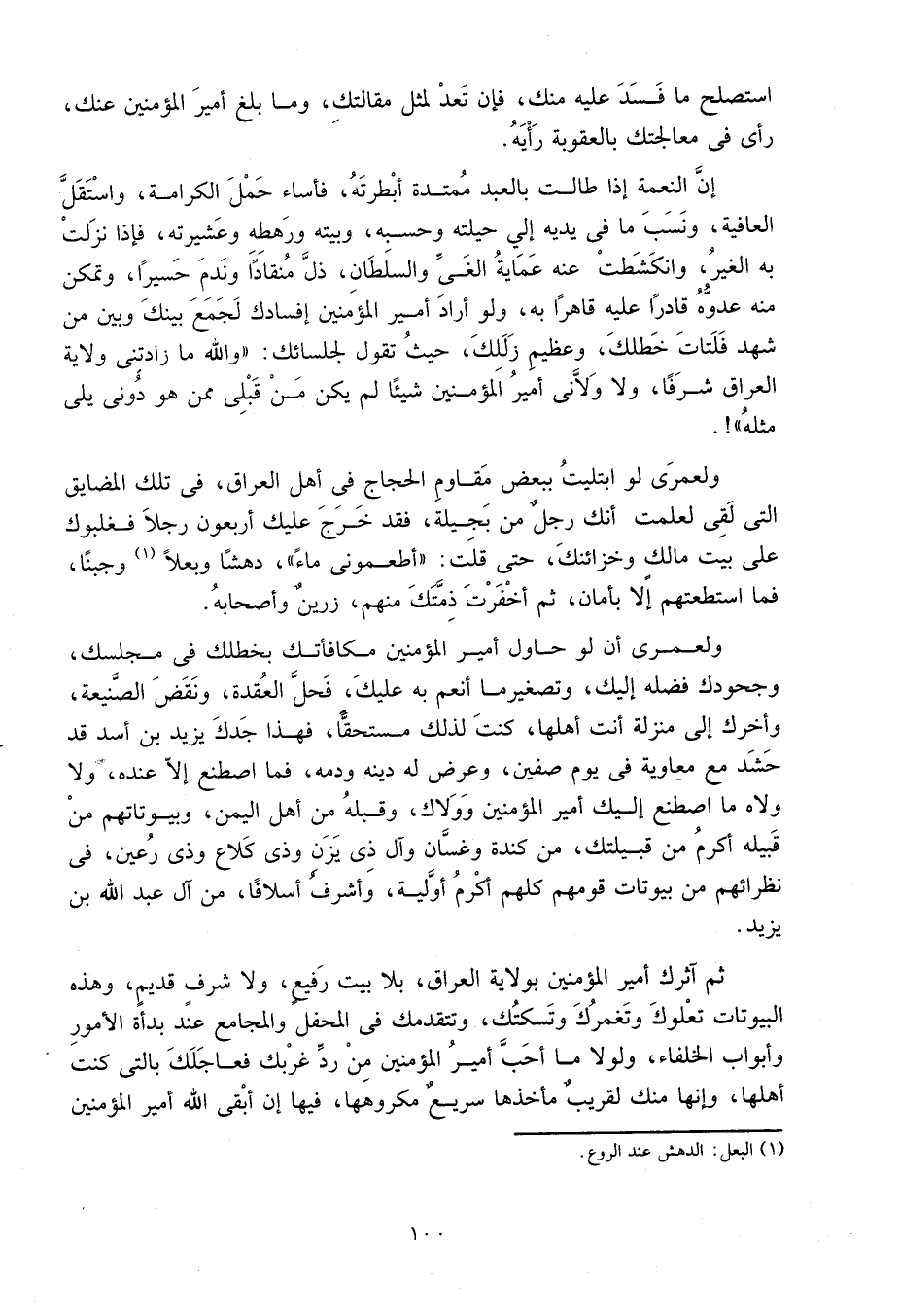 ثم أثرك أمير المؤمنين بولاية العراق، بلا بيت رفيع، ولا شرف قديم، وهذه البيوتات تعلوك وتغمرك وتسكتك، وتتقدمك في المحفل والمجامع عند بدأة الأمور وأبواب الخلفاء، ولولا ما أحب أمير المؤمنين من رد غربك؛ لعاجلك بالتي كانت أهلها، وإنها منك لقريب مأخذها، سريع مكروهها. فيها، إن أبقى الله أمير المؤمنين،