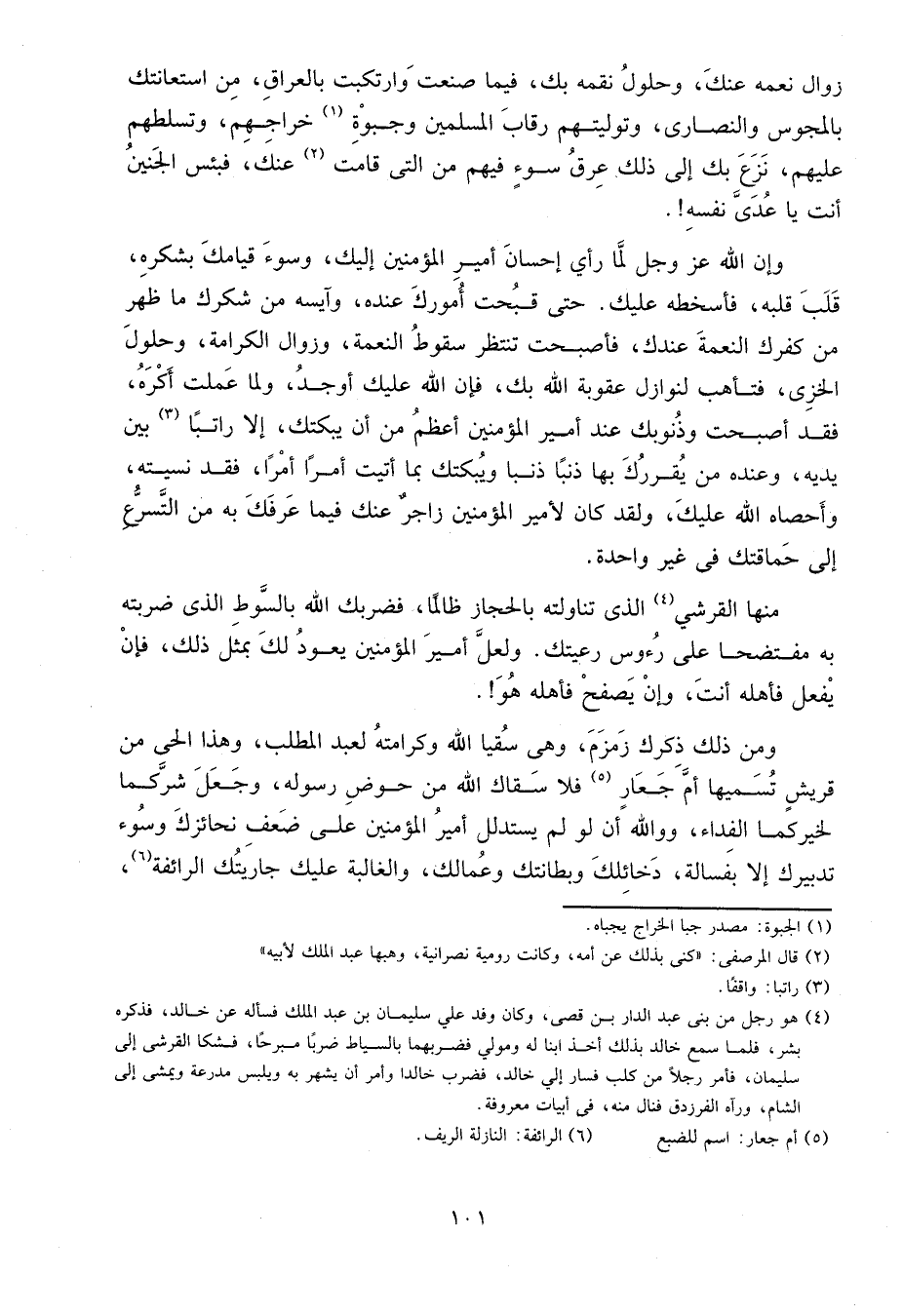 منها القرشي4 الذي تناولته بالحجاز ظالماً، فضربك الله بالسوط الذي ضربته به مفتضحاً على رؤوس رعيتك، ولعل أمير المؤمنين يعود لك بمثل ذلك، فإن يفعل فأهله أنت، وإن يصفح فأهله هو! ومن ذلك ذكرك زمزم، وهي سقيا الله وكرامته لعبد المطلب وهذا الحي من قريش تسميها أم جعار5؛ فلا سقاك الله من حوض رسوله، وجعل شركما لخيركما الفداء، ووالله أن لو لم يستدلل أمير المؤمنين على صنف نحائزك وسوء تدبيرك إلا بفسالة دخائلك وبطانتك وعمالك، والغالبة عليك جاريتك الرائفة6،