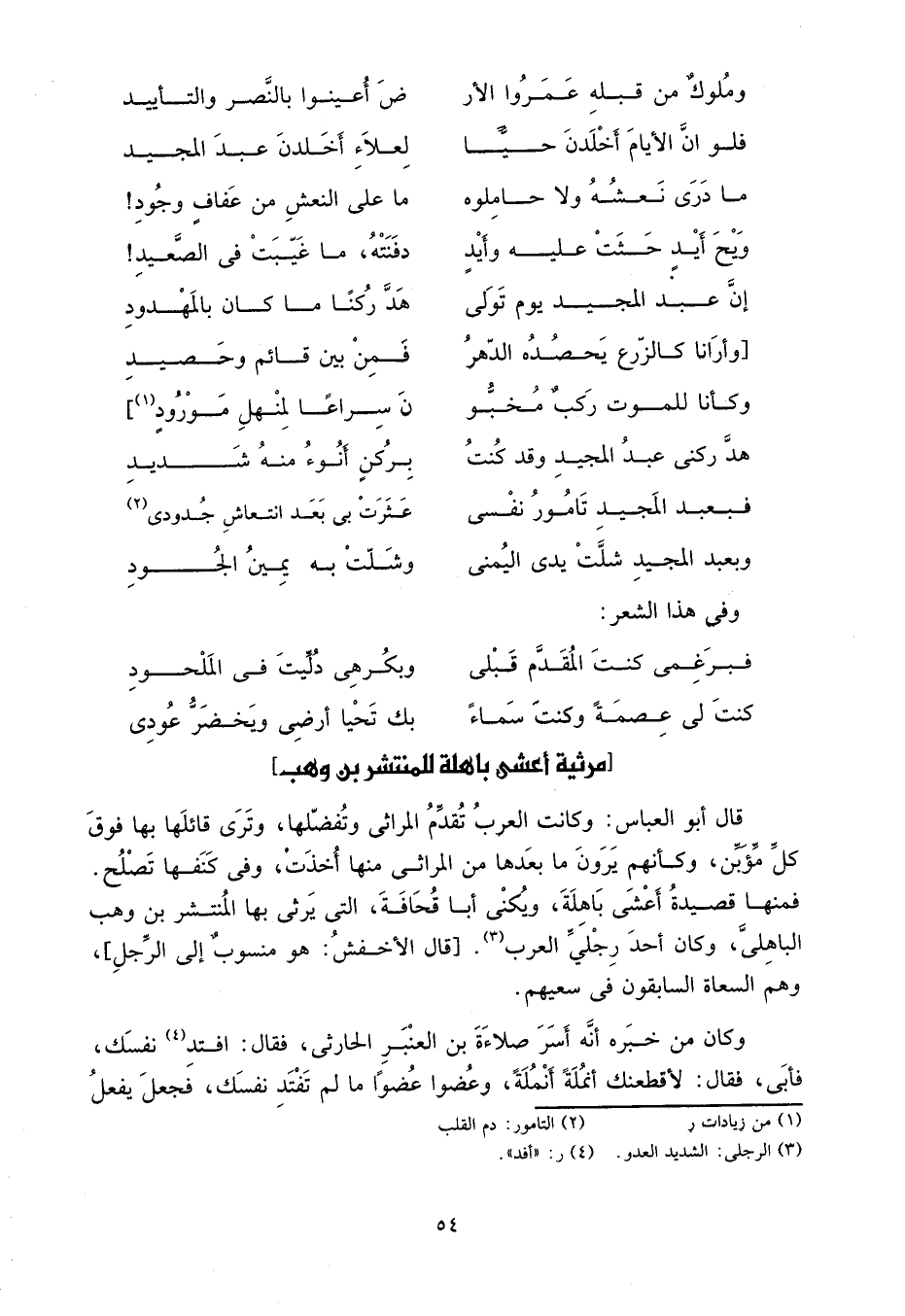 قال أبو العباس: وكانت العرب تقدم مراثي وتفضلها، وترى قائلها بها فوق كل مؤبن، وكأنهم يرون ما بعدها من المراثي منها أخذت، وفي كنفها تصلح. فمنها قصيدة أعشى باهلة، ويكنى أبا قحافة، التي يرثي بها المنتشر بن وهب الباهلي، وكان أحد رجليي العرب1. [قال الأخفش: هو منسوب إلى الرجل] ، وهم السعاة السابقون في سعيهم.