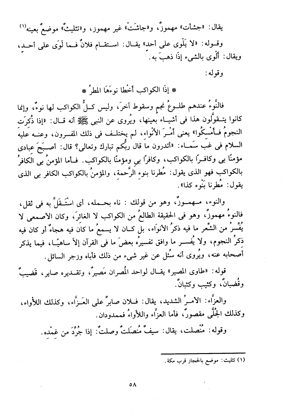 والنوء، مهموز، وهو من قولك: ناء بجمله، أي استقل به في ثقل، فالنوء مهموز، وهو في الحقيقة الطالع من الكواكب لا الغائر، وكان الأصمعي لا يفسر من الشعر ما فيه ذكر الأنواء، بل كان لا يسمع ما كان فيه هجاء أو كان فيه ذكر النجوم، ولا يفسر ما وافق تفسيره بعض ما في القرآن إلا ساهياً. فيما يذكر أصحابه عنه. ويروى أنه سئل عن غير شيء من ذلك فأباه وزجر السائل.