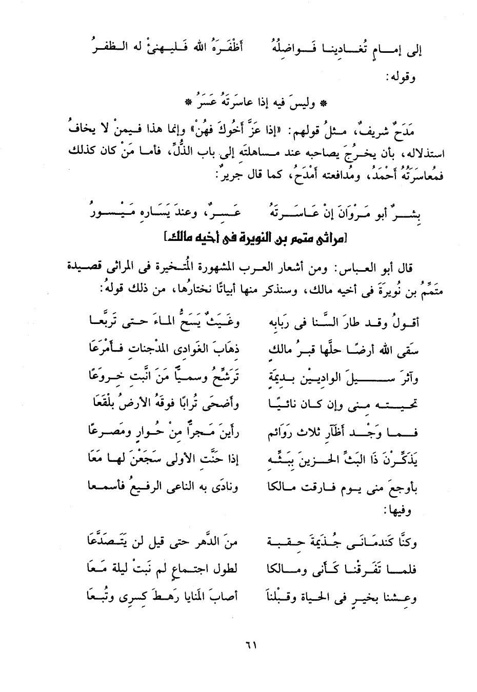 قال أبو العباس: ومن أشعار العرب المشهورة المتخيرة في المراثي قصيدة متمم بن نويرة في أخيه مالك، وسنذكر منها أبياتاً نختارها، من ذلك قوله: