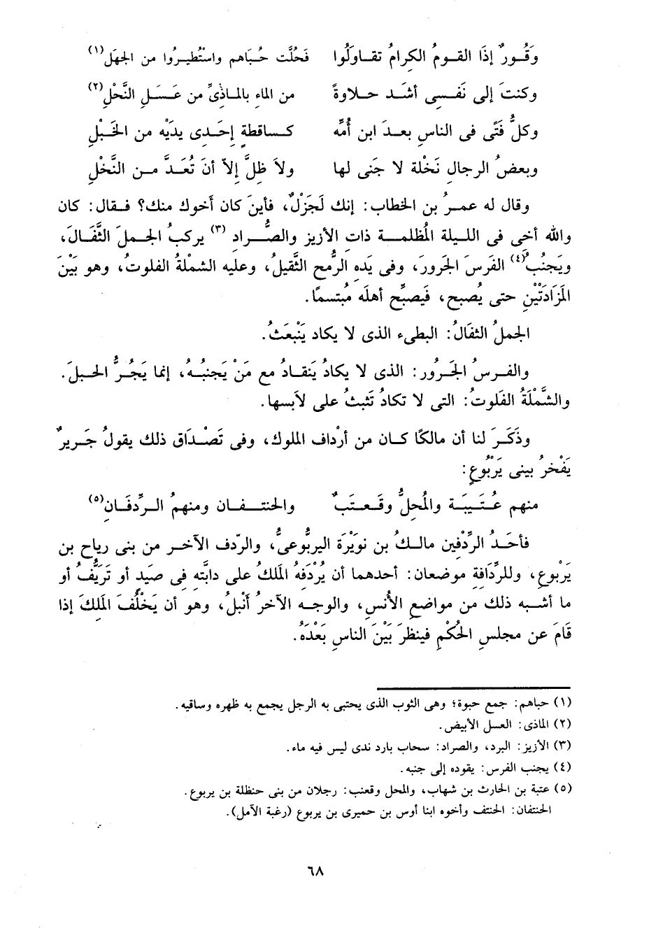 وقال له عمر بن الخطاب: إنك لجزل؛ فأين كان أخوك منك? فقال: كان والله في الليلة المظلمة ذات الأزير والصراد3، يركب الجمل الثفال، ويجنب4 الفرس الجرور، وفي يده الرمح الثقيل، وعليه الشملة الفلوت، وهو بين المزادتين حتى يصبح، فيصبح أهله متبسماً.