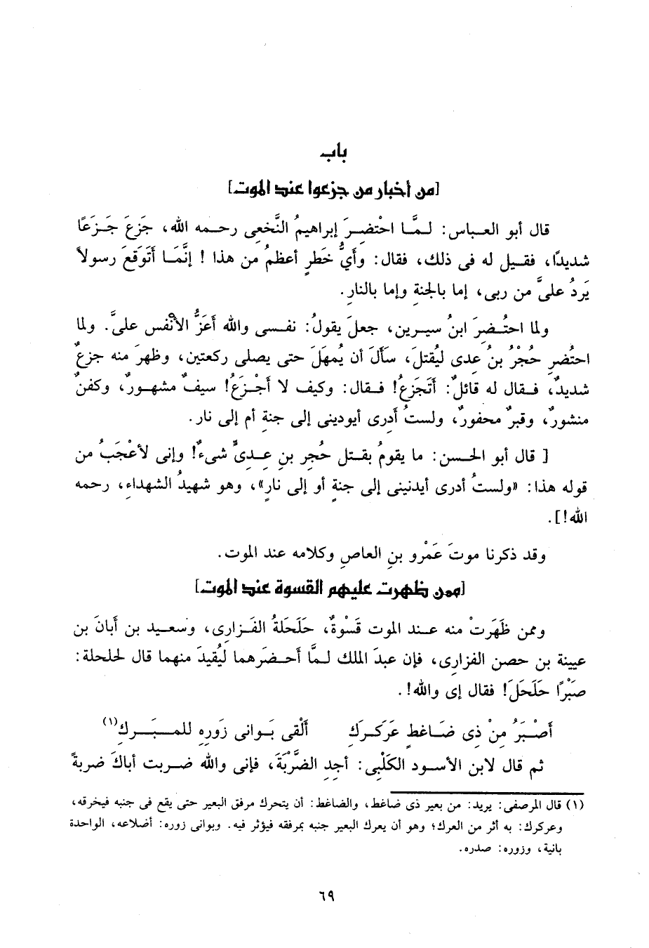 ولما احتضر حجر بن عدي ليقتل، سأل أن يمهل حتى يصلي ركعتين، وظهر منه جزع شديد،، فقال له قائل: أتجزع! فقال: وكيف لا أجزع! سيف مشهور، وكفن منشور، وقبر محفور، ولست أدري أيؤديني إلى جنة، أم إلى نار.