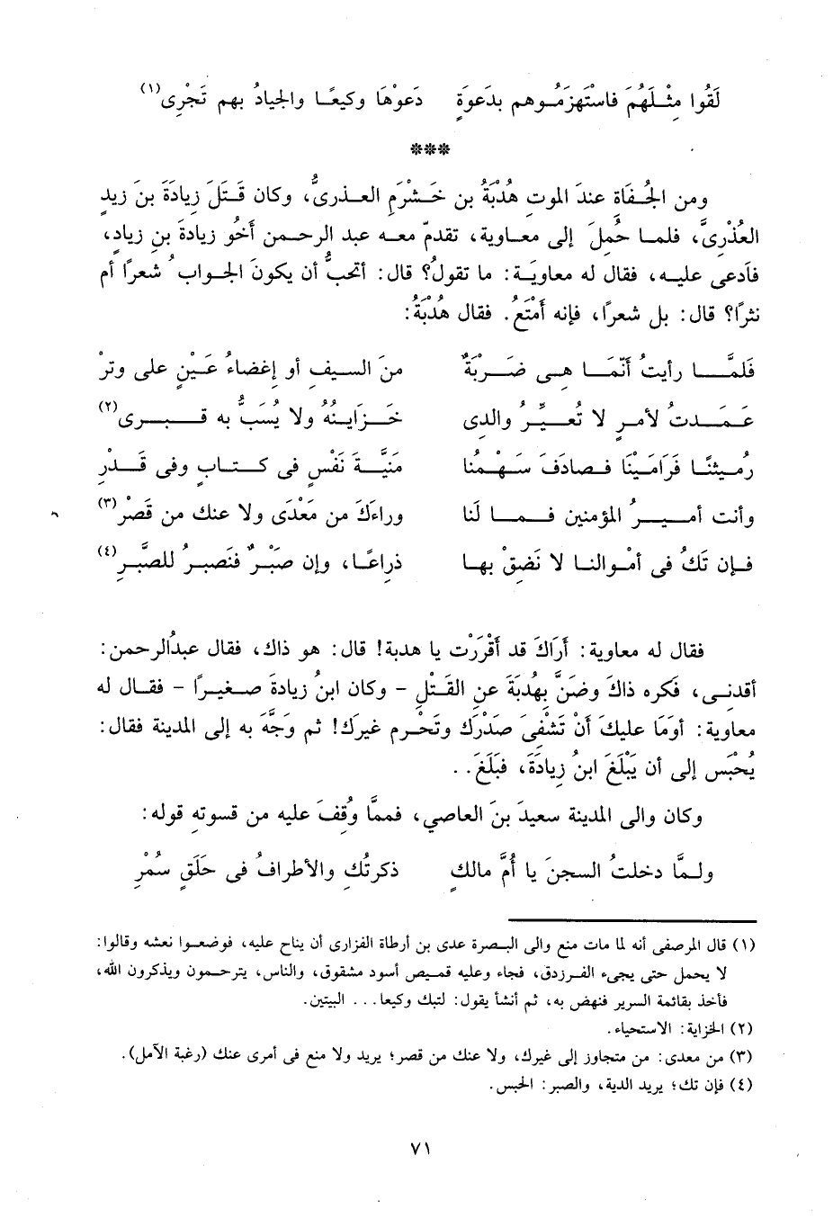 ومن الجفاة عند الموت هدبة نب خشرم العذري، وكان قتل زيادة بن زيد العذري، فلما حمل إلى معاوية، تقدم معه عبد الرحمن أخو زيادة بن زيد، فادعى عليه، فقال له معاوية: ما تقول? قال: أتحب أن يكون الجواب شعراً أم نثراً? قال: بل شعراً فإنه أمتع، فقال هدبة: