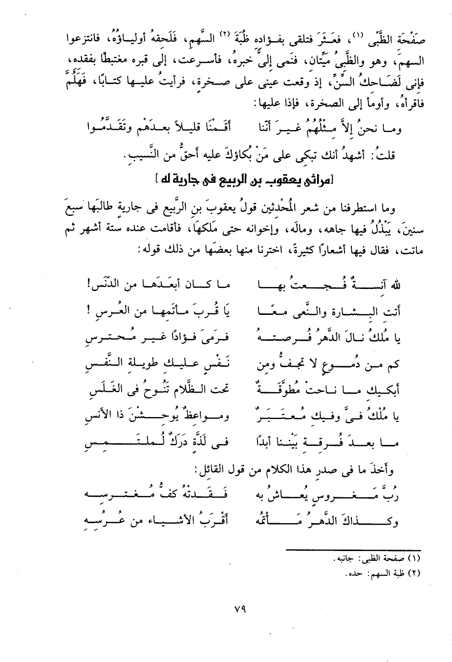 صفحة الظبي1، فعثر فتلقى بفؤاده ظبة2 السهم، فلحقه أولياؤه فانتزعوا السهم وهو والظبي ميتان، فنمى إلي خبره، فأسرعت إلى قبره معتبطاً بفقده، فإني لضاحك السن؛ إذ وقعت عيني على صخرة، فرأيت عليها كتاباً، فهلم فاقرأه، وأومأ إلى الصخرة، فإذا عليها: