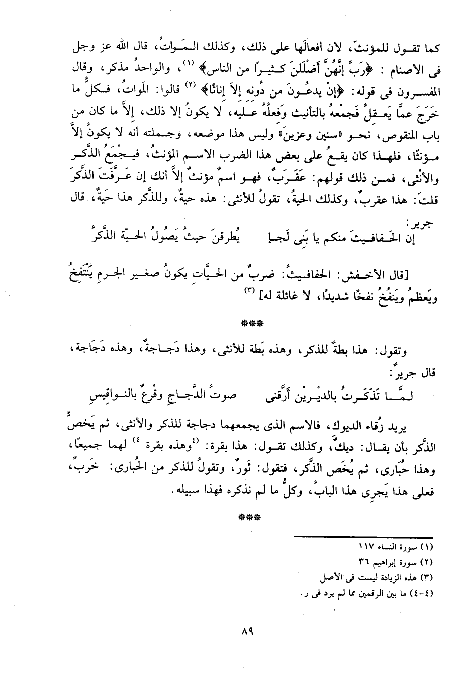 كما تقول للمؤنث، لأن أفعالها على ذلك، وكذلك الموات، قال الله عز وجل في الأصنام: {رَبِّ إِنَّهُنَّ أَضْلَلْنَ كَثِيراً مِنَ النَّاسِ} 1، والواحد مذكر. وقال المفسرون في قوله: {إِنْ يَدْعُونَ مِنْ دُونِهِ إِلَّا إِنَاثاً} 2، قالوا: الموات، فكل ما خرج عما يعقل فجمعه بالتانيث وفعله عليه، لا يكون إلا ذلك، إلا ما كان من باب المنقوص. نحو سنين وعزين وليس هذا موضعه. وجملته أنه لا يكون إلا مؤنثاً، فلهذا كان يقع على بعض هذا الضرب الاسم المؤنث، فيجمع الذكر والأنثى، فمن ذلك قولهم: عقرب، فهن اسم مؤنث، إلا أنك إن عرفت الذكر قلت: هذا عقرب، وكذلك الحية، تقول للأنثى: هذه حية، وللذكر هذا حية، قال جرير:
