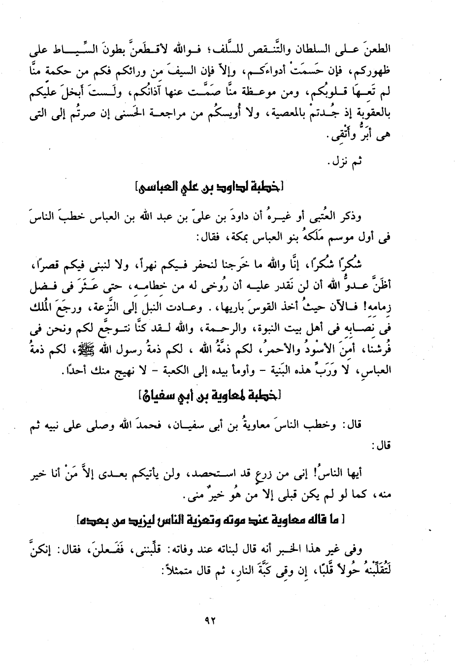 وذكر العتبي أو غيره أن داود بن علي بن عبد الله بن العباس خطب الناس في أول موسم ملكه بنو العباس، بمكة. فقال: شكراً شكراً، إنا والله ما خرجنا لنحفر فيكم نهراً، ولا لنبني فيكم قصراً، أظن عدو الله أن لن نقدر عليه أن روخي له من خطامه، حتى عثر في فضل زمامه! فالآن حيث أخذ القوس باريها، وعادت النبل إلى النزعة، ورجع الملك في نصابه في أهل بيت النبوة والرحمة. والله لقد كنا نتوجع لكم ونحن في فرشنا. أمن الأسود والأحمر، لكم ذمة الله، لكم ذمة رسول الله صَلَّى اللَّهُ عَلَيْهِ وَسَلَّمَ، لكم ذمة العباس، لا ورب هذه البنية - وأومأ بيده إلى الكعبة - لا نهيج منكم أحداً.