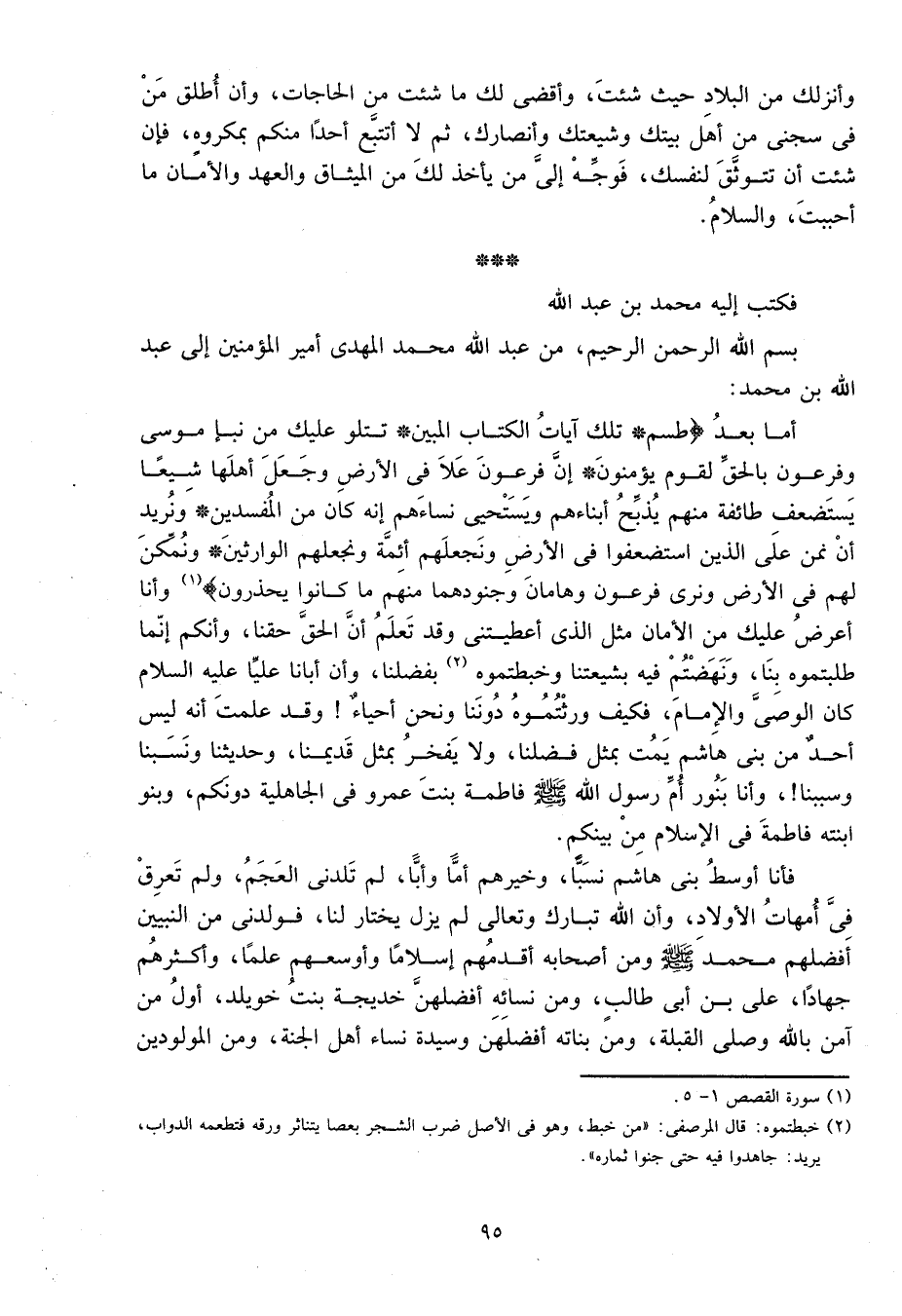 فكتب إليه محمد بن عبد الله: بسم الله الرحمن الرحيم، من عبد الله محمد المهدي أمير المؤمنين إلى عبد الله بن محمد: أما بعد: {طسم تِلْكَ آيَاتُ الْكِتَابِ الْمُبِينِ نَتْلُو عَلَيْكَ مِنْ نَبَأِ مُوسَى وَفِرْعَوْنَ بِالْحَقِّ لِقَوْمٍ يُؤْمِنُونَ إِنَّ فِرْعَوْنَ عَلا فِي الْأَرْضِ وَجَعَلَ أَهْلَهَا شِيَعاً يَسْتَضْعِفُ طَائِفَةً مِنْهُمْ يُذَبِّحُ أَبْنَاءَهُمْ وَيَسْتَحْيِي نِسَاءَهُمْ إِنَّهُ كَانَ مِنَ الْمُفْسِدِينَ وَنُرِيدُ أَنْ نَمُنَّ عَلَى الَّذِينَ اسْتُضْعِفُوا فِي الْأَرْضِ وَنَجْعَلَهُمْ أَئِمَّةً وَنَجْعَلَهُمُ الْوَارِثِينَ وَنُمَكِّنَ لَهُمْ فِي الْأَرْضِ وَنُرِيَ فِرْعَوْنَ وَهَامَانَ وَجُنُودَهُمَا مِنْهُمْ مَا كَانُوا يَحْذَرُونَ} 1، وأنا أعرض عليك من الأمان مثل الذي أعطيتني وقد تعلم أن الحق حقنا، وأنكم إنما طلبتموه بنا، ونهضتم فيه بشيعتنا، وخبطتموه2 بفضلنا، وأن أبانا علياً عليه السلام كان الوصي والإمام، فكيف ورثتموه دوننا ونحن أحياء! وقد علمت أنه ليس أحد من بني هاشم يمت بمثل فضلنا، ولا يفخر بمثل قديمنا وحديثنا ونسبنا وسببنا! وإنا بنو أم رسول الله صَلَّى اللَّهُ عَلَيْهِ وَسَلَّمَ فاطمة بنت عمرو في الجاهلية دونكم، وبنو ابنته فاطمة في الإسلام من بينكم.