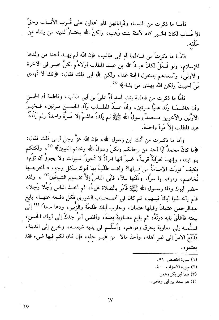 فأما ما ذكرت من النساء وقراباتهن فلو أعطين على قرب الأنساب وحق الأحساب لكان الخير كله لآمنة بنت وهب، ولكن الله يختار لدينه من يشاء من خلقه.