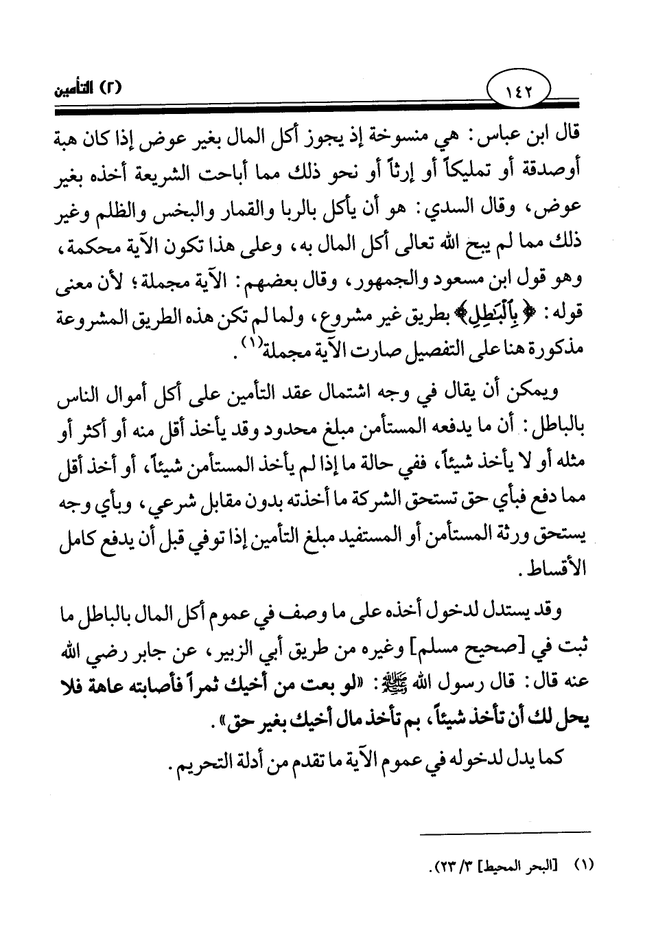 ويمكن أن يقال في وجه اشتمال عقد التأمين على أكل أموال الناس بالباطل: أن ما يدفعه المستأمن مبلغ محدود وقد يأخذ أقل منه أو أكثر أو مثله أو لا يأخذ شيئا، ففي حالة ما إذا لم يأخذ المستأمن شيئا، أو أخذ أقل مما دفع فبأي حق تستحق الشركة ما أخذته بدون مقابل شرعي، وبأي وجه يستحق ورثة المستأمن أو المستفيد مبلغ التأمين إذا توفي قبل أن يدفع كامل الأقساط.