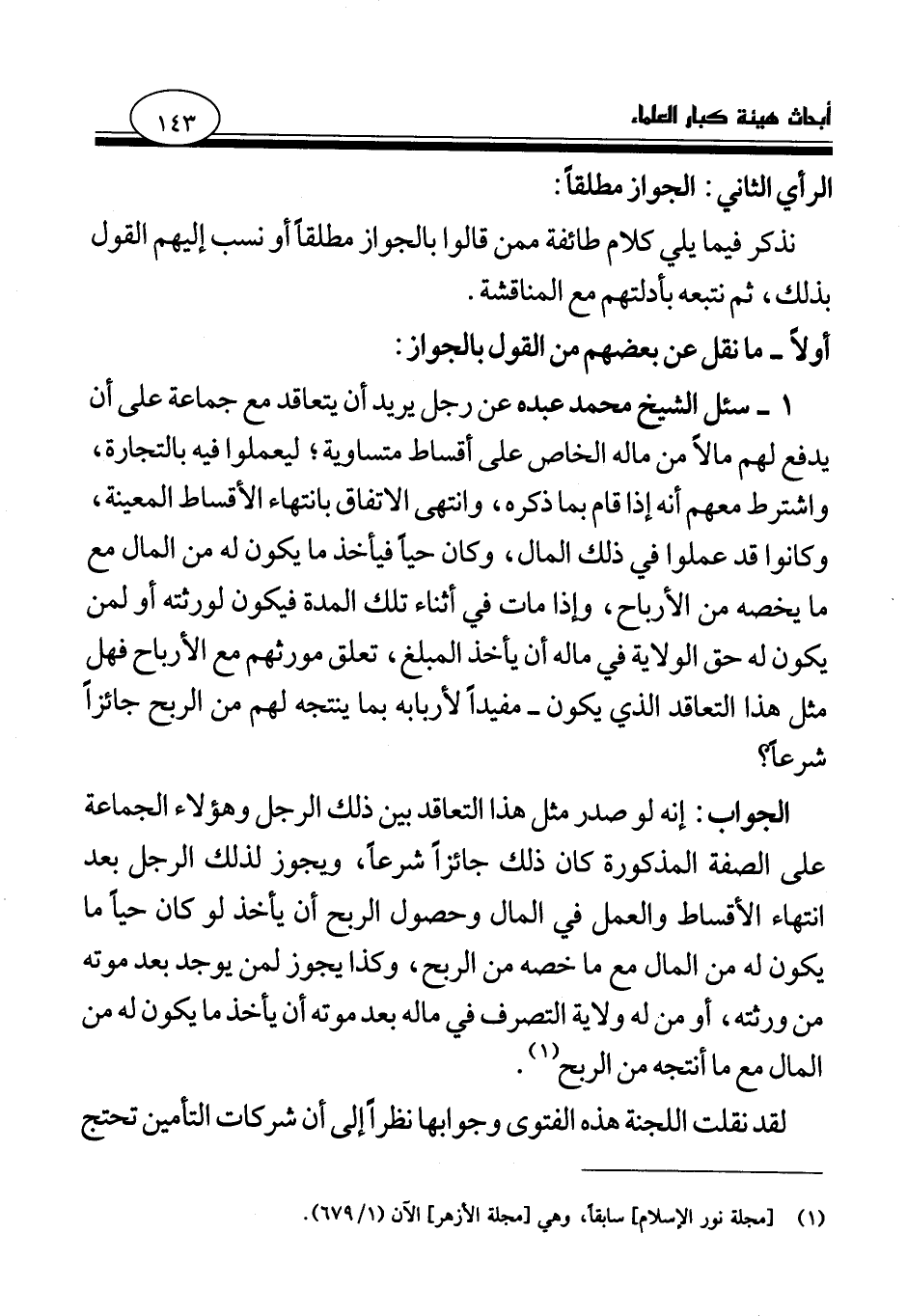 1 - سئل الشيخ محمد عبده عن رجل يريد أن يتعاقد مع جماعة على أن يدفع لهم مالا من ماله الخاص على أقساط متساوية؛ ليعملوا فيه بالتجارة، واشترط معهم أنه إذا قام بما ذكره، وانتهى الاتفاق بانتهاء الأقساط المعينة، وكانوا قد عملوا في ذلك المال، وكان حيا فيأخذ ما يكون له من المال مع ما يخصه من الأرباح، وإذا مات في أثناء تلك المدة فيكون لورثته أو لمن يكون له حق الولاية في ماله أن يأخذ المبلغ، تعلق مورثهم مع الأرباح فهل مثل هذا التعاقد الذي يكون- مفيدا لأربابه بما ينتجه لهم من الربح جائزا شرعا؟