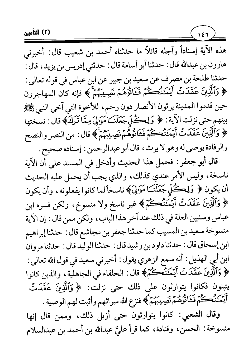 هذه الآية إسنادا وأجله قائلا ما حدثناه أحمد بن شعيب قال: أخبرني هارون بن عبد الله قال: حدثنا أبو أسامة قال: حدثني إدريس بن يزيد، قال: حدثنا طلحة بن مصرف عن سعيد بن جبير عن ابن عباس «في قوله تعالى: فإنه كان المهاجرون حين قدموا المدينة يرثون الأنصار دون رحم، للأخوة التي آخى النبي صلى الله عليه وسلم بينهم حتى نزلت الآية: قال: نسختها قال: من النصر والنصح والرفادة يوصى له وهو لا يرث، (¬4) » قال أبو عبد الرحمن: إسناده صحيح.