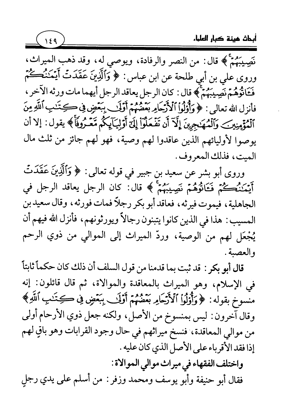 وروى أبو بشر عن سعيد بن جبير في قوله تعالى: {وَالَّذِينَ عَقَدَتْ أَيْمَانُكُمْ فَآتُوهُمْ نَصِيبَهُمْ} (¬3) قال: كان الرجل يعاقد الرجل في الجاهلية، فيموت فيرثه، فعاقد أبو بكر رجلا فمات فورثه، وقال سعيد بن المسيب: هذا في الذين كانوا يتبنون رجالا ويورثونهم، فأنزل الله فيهم أن يجعل لهم من الوصية، ورد الميراث إلى الموالي من ذوي الرحم والعصبة.