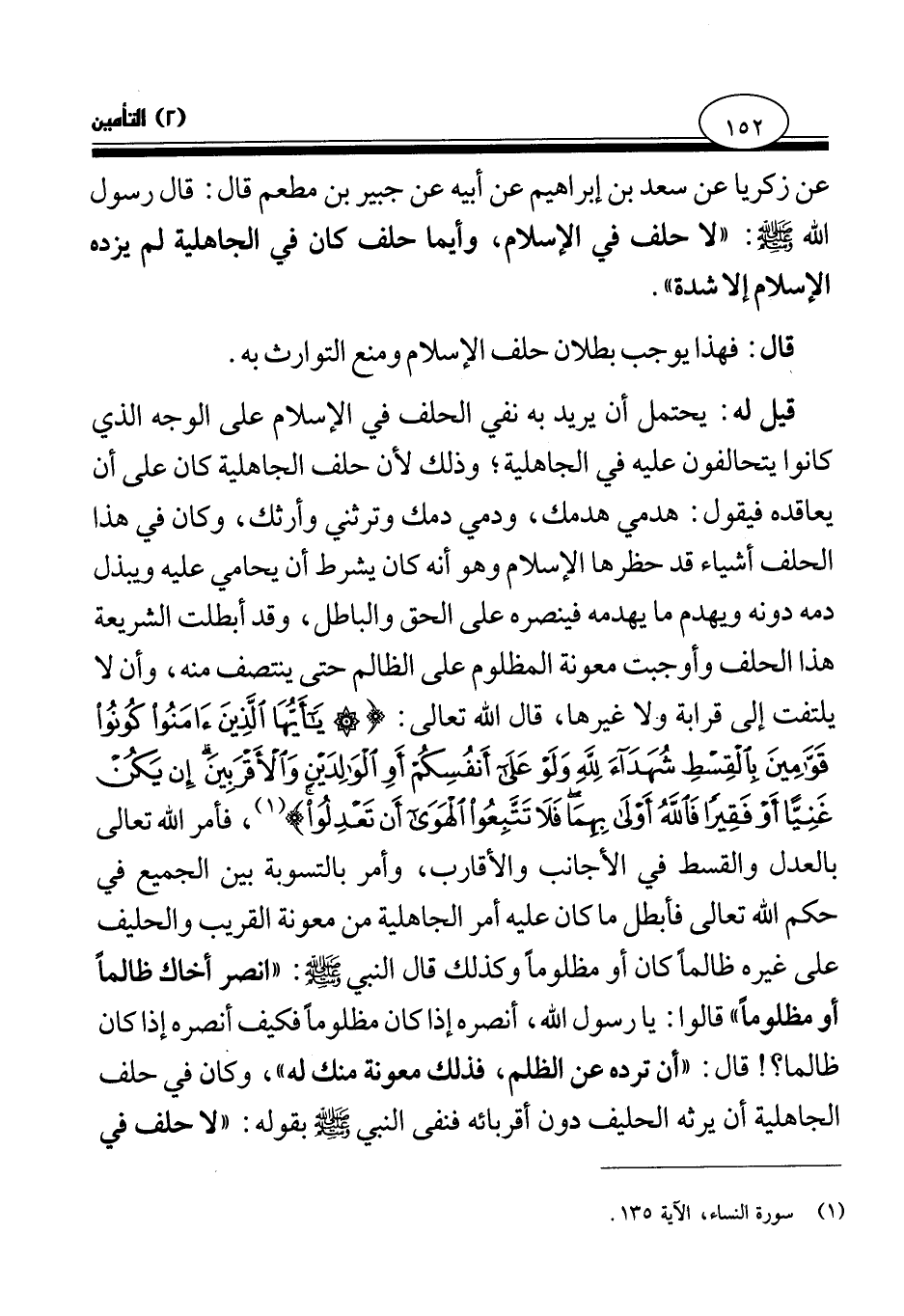 قيل له: يحتمل أن يريد به نفي الحلف في الإسلام على الوجه الذي كانوا يتحالفون عليه في الجاهلية؛ وذلك لأن حلف الجاهلية كان على أن يعاقده فيقول: هدمي هدمك، ودمي دمك وترثني وأرثك، وكان في هذا الحلف أشياء قد حظرها الإسلام وهو أنه كان يشرط أن يحامي عليه ويبذل دمه دونه ويهدم ما يهدمه فينصره على الحق والباطل، وقد أبطلت الشريعة هذا الحلف وأوجبت معونة المظلوم على الظالم حتى ينتصف منه، وأن لا يلتفت إلى قرابة ولا غيرها، قال الله تعالى: {يَا أَيُّهَا الَّذِينَ آمَنُوا كُونُوا قَوَّامِينَ بِالْقِسْطِ شُهَدَاءَ لِلَّهِ وَلَوْ عَلَى أَنْفُسِكُمْ أَوِ الْوَالِدَيْنِ وَالْأَقْرَبِينَ إِنْ يَكُنْ غَنِيًّا أَوْ فَقِيرًا فَاللَّهُ أَوْلَى بِهِمَا فَلَا تَتَّبِعُوا الْهَوَى أَنْ تَعْدِلُوا} (¬2) فأمر الله تعالى بالعدل والقسط في الأجانب والأقارب، وأمر بالتسوية بين الجميع في حكم الله تعالى فأبطل ما كان عليه أمر الجاهلية من معونة القريب والحليف على غيره ظالما كان أو مظلوما وكذلك قال النبي - صلى الله عليه وسلم -: «انصر أخاك ظالما أو مظلوما قالوا: يا رسول الله، أنصره إذا كان مظلوما فكيف أنصره إذا كان ظالما، قال: أن ترده عن الظلم، فذلك معونة منك له (¬3) » ، وكان في حلف الجاهلية أن يرثه الحليف دون أقربائه فنفى النبي - صلى الله عليه وسلم - بقوله: «لا حلف في