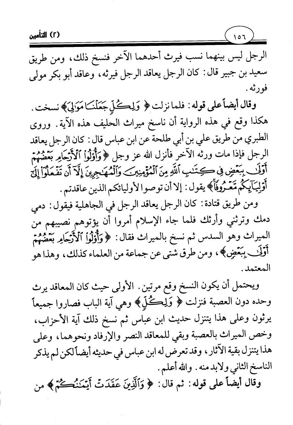ويحتمل أن يكون النسخ وقع مرتين. الأولى حيث كان المعاقد يرث وحده دون العصبة فنزلت {وَلِكُلٍّ} (¬4) وهي آية الباب فصاروا جميعا يرثون وعلى هذا يتنزل حديث ابن عباس ثم نسخ ذلك آية الأحزاب، وخص الميراث بالعصبة وبقي للمعاقد النصر والإرفاد ونحوهما، وعلى هذا يتنزل بقية الآثار، وقد تعرض له ابن عباس في حديثه أيضا لكن لم يذكر الناسخ الثاني ولا بد منه. والله أعلم.