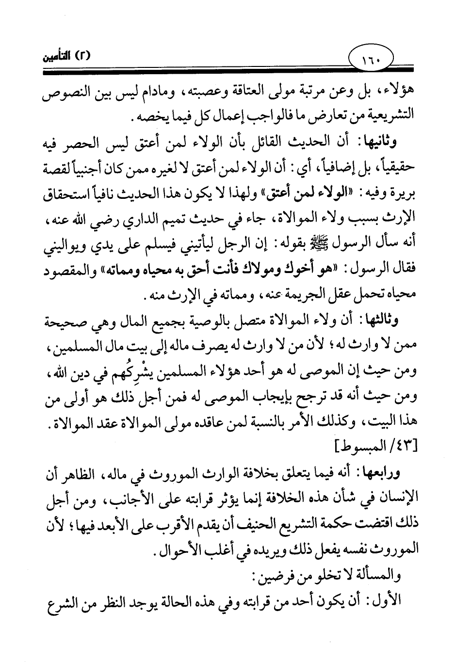 وثانيها: أن الحديث القائل بأن «الولاء لمن أعتق (¬1) » ليس الحصر فيه حقيقيا، بل إضافيا، أي: أن الولاء لمن أعتق لا لغيره ممن كان أجنبيا لقصة بريرة وفيه: «الولاء لمن أعتق (¬2) » ولهذا لا يكون هذا الحديث نافيا استحقاق الإرث بسبب ولاء الموالاة، جاء في حديث تميم الداري - رضي الله عنه -، أنه سأل الرسول - صلى الله عليه وسلم - بقوله: «إن الرجل ليأتيني فيسلم على يدي ويواليني فقال الرسول: هو أخوك ومولاك فأنت أحق به محياه ومماته» والمقصود محياه تحمل عقل الجريمة عنه، ومماته في الإرث منه.