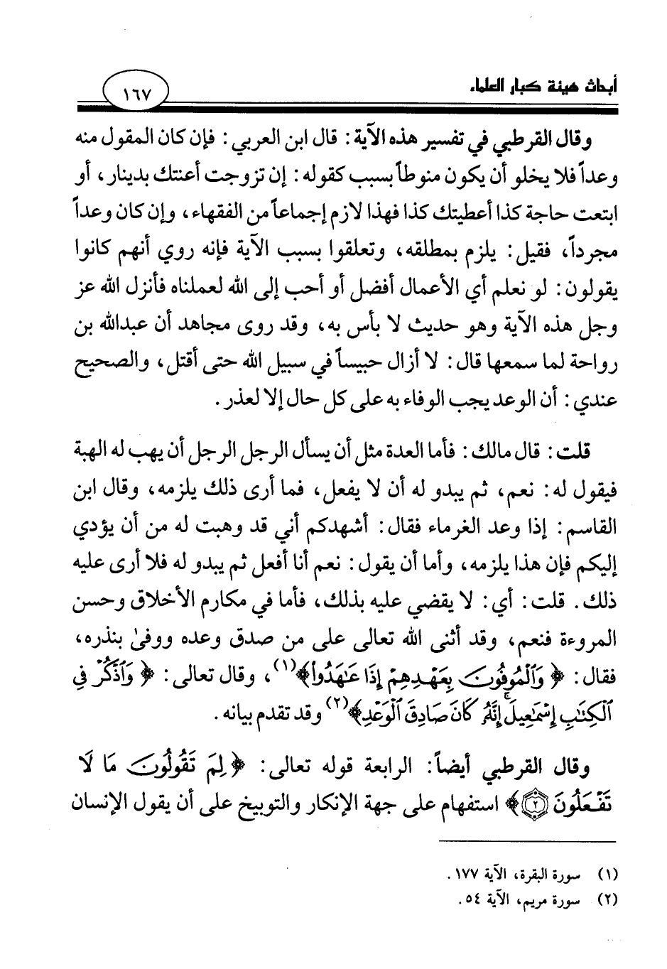 وقال القرطبي في تفسير هذه الآية: قال ابن العربي: فإن كان المقول منه وعدا فلا يخلو أن يكون منوطا بسبب كقوله: إن تزوجت أعنتك بدينار، أو ابتعت حاجة كذا أعطيتك كذا فهذا لازم إجماعا من الفقهاء، وإن كان وعدا مجردا، فقيل: يلزم بمطلقه، وتعلقوا بسبب الآية فإنه روي أنهم كانوا يقولون: لو نعلم أي الأعمال أفضل أو أحب إلى الله لعملناه فأنزل الله عز وجل هذه الآية وهو حديث لا بأس به، وقد روى مجاهد أن عبد الله بن رواحة لما سمعها قال: لا أزال حبيسا في سبيل الله حتى أقتل، والصحيح عندي: أن الوعد يجب الوفاء به على كل حال إلا لعذر.