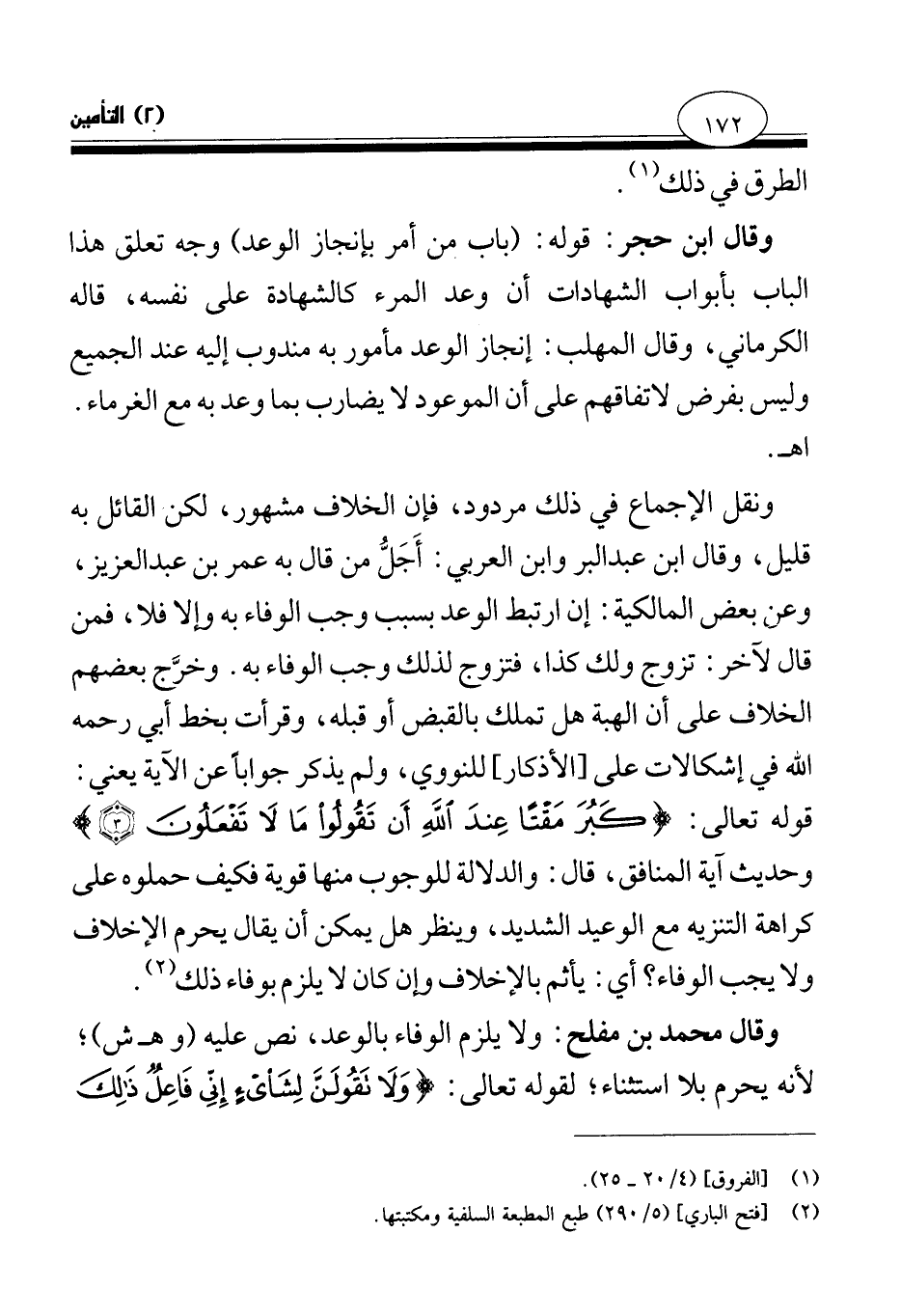 وقال محمد بن مفلح: ولا يلزم الوفاء بالوعد، نص عليه (وهـ ش) ؛ لأنه يحرم بلا استثناء؛ لقوله تعالى: {وَلَا تَقُولَنَّ لِشَيْءٍ إِنِّي فَاعِلٌ ذَلِكَ غَدًا} (¬4) {إِلَّا أَنْ يَشَاءَ اللَّهُ} (¬5)