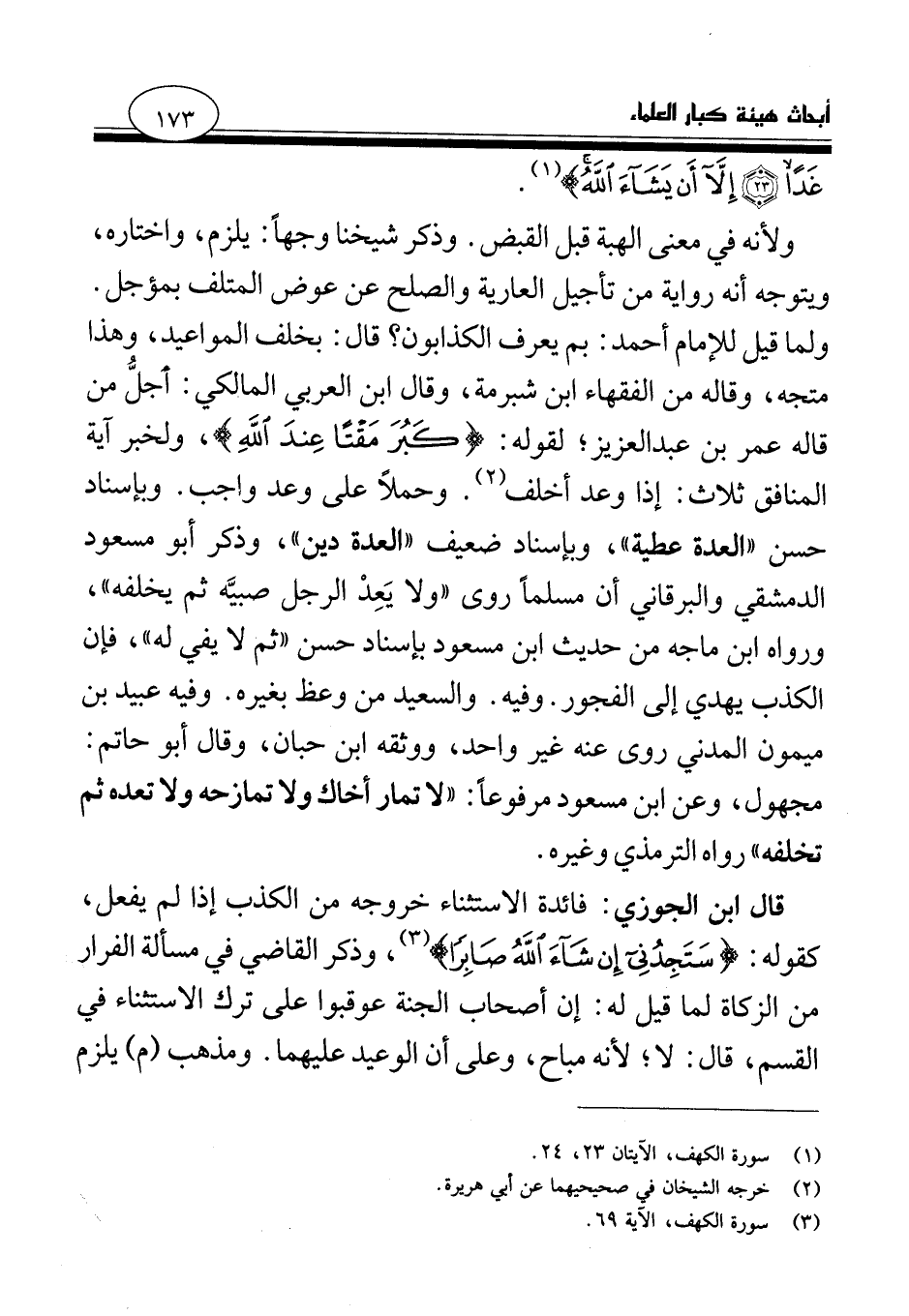 قال ابن الجوزي: فائدة الاستثناء خروجه من الكذب إذا لم يفعل، كقوله: ستجدني - إن شاء الله صابرا، وذكر القاضي في مسألة الفرار من الزكاة لما قيل له: إن أصحاب الجنة عوقبوا على ترك الاستثناء في القسم، قال: لا؛ لأنه مباح، وعلى أن الوعيد عليهما. ومذهب (م) يلزم