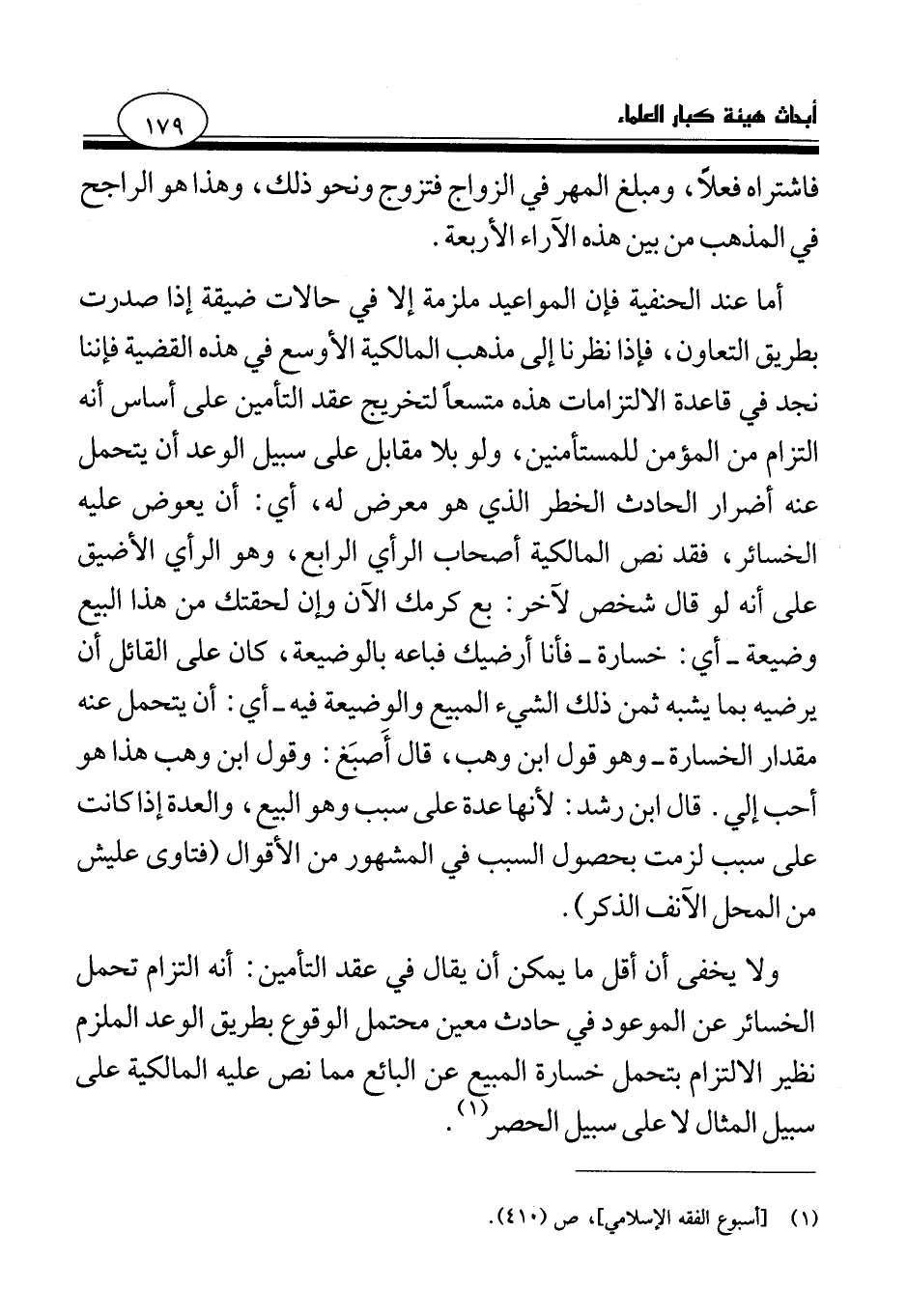 أما عند الحنفية فإن المواعيد ملزمة إلا في حالات ضيقة إذا صدرت بطريق التعاون، فإذا نظرنا إلى مذهب المالكية الأوسع في هذه القضية فإننا نجد في قاعدة الالتزامات هذه متسعا لتخريج عقد التأمين على أساس أنه التزام من المؤمن للمستأمنين، ولو بلا مقابل على سبيل الوعد أن يتحمل عنه أضرار الحادث الخطر الذي هو معرض له، أي: أن يعوض عليه الخسائر، فقد نص المالكية أصحاب الرأي الرابع، وهو الرأي الأضيق على أنه لو قال شخص لآخر: بع كرمك الآن وإن لحقتك من هذا البيع وضيعة- أي: خسارة- فأنا أرضيك فباعه بالوضيعة، كان على القائل أن يرضيه بما يشبه ثمن ذلك الشيء المبيع والوضيعة فيه- أي: أن يتحمل عنه مقدار الخسارة- وهو قول ابن وهب، قال أصبغ: وقول ابن وهب هذا هو أحب إلي. قال ابن رشد: لأنها عدة على سبب وهو البيع، والعدة إذا كانت على سبب لزمت بحصول السبب في المشهور من الأقوال (فتاوى عليش من المحل الآنف الذكر) .