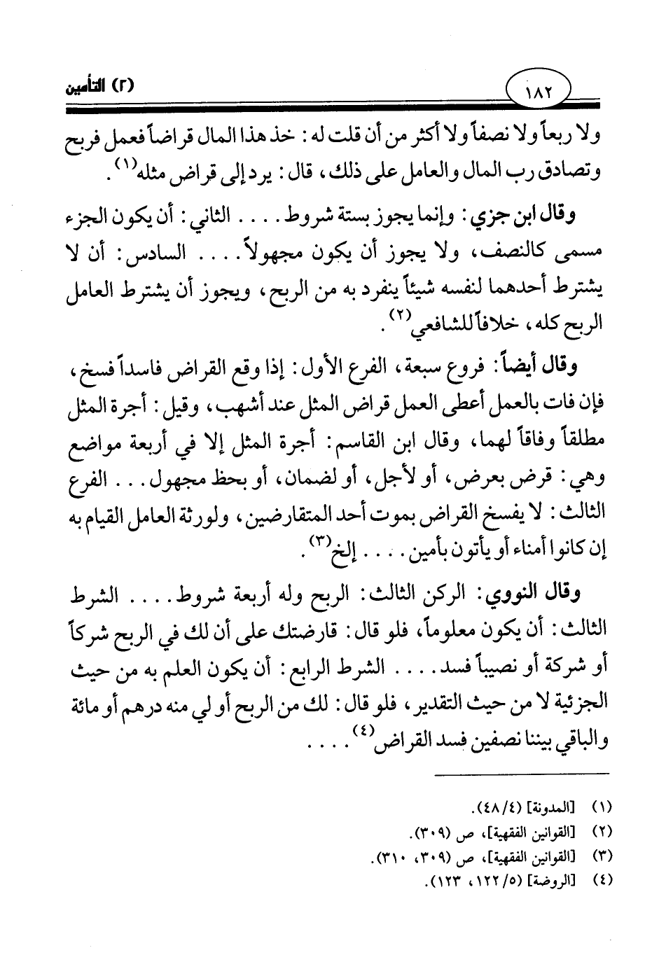 وقال النووي: الركن الثالث: الربح وله أربعة شروط. . . . الشرط الثالث: أن يكون معلوما، فلو قال: قارضتك على أن لك في الربح شركا أو شركة أو نصيبا فسد. . . . الشرط الرابع: أن يكون العلم به من حيث الجزئية لا من حيث التقدير، فلو قال: لك من الربح أو لي منه درهم أو مائة والباقي بيننا نصفين فسد القراض (¬4) . . . .