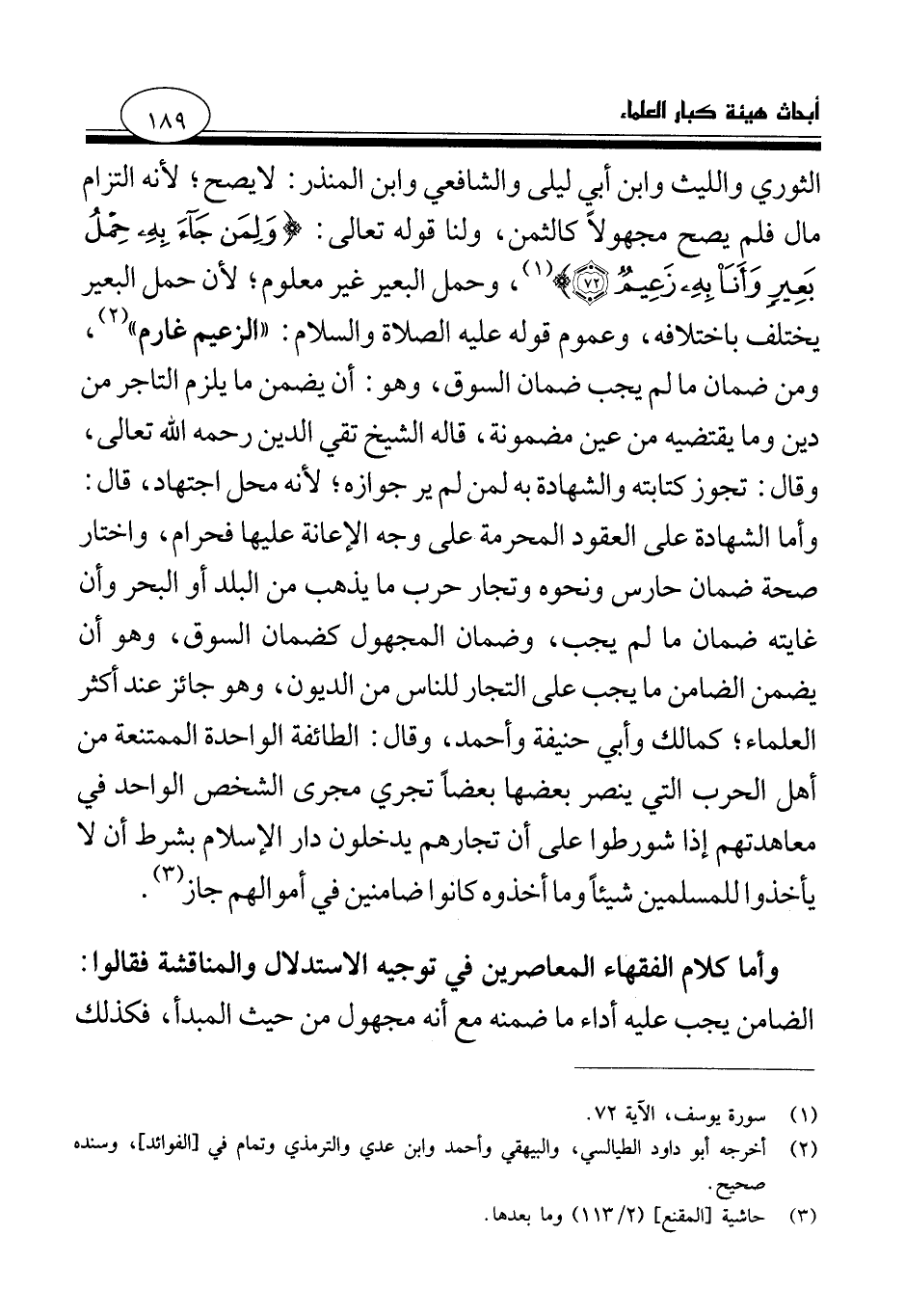 الثوري والليث وابن أبي ليلى والشافعي وابن المنذر: لا يصح؛ لأنه التزام مال فلم يصح مجهولا كالثمن، ولنا قوله تعالى: {وَلِمَنْ جَاءَ بِهِ حِمْلُ بَعِيرٍ وَأَنَا بِهِ زَعِيمٌ} (¬1) وحمل البعير غير معلوم؛ لأن حمل البعير يختلف باختلافه، وعموم قوله - عليه الصلاة والسلام -: «الزعيم غارم (¬2) » ، ومن ضمان ما لم يجب ضمان السوق، وهو: أن يضمن ما يلزم التاجر من دين وما يقتضيه من عين مضمونة، قاله الشيخ تقي الدين رحمه الله تعالى، وقال: تجوز كتابته والشهادة به لمن لم ير جوازه؛ لأنه محل اجتهاد، قال: وأما الشهادة على العقود المحرمة على وجه الإعانة عليها فحرام، واختار صحة ضمان حارس ونحوه وتجار حرب ما يذهب من البلد أو البحر وأن غايته ضمان ما لم يجب، وضمان المجهول كضمان السوق، وهو أن يضمن الضامن ما يجب على التجار للناس من الديون، وهو جائز عند أكثر العلماء؛ كمالك وأبي حنيفة وأحمد، وقال: الطائفة الواحدة الممتنعة من أهل الحرب التي ينصر بعضها بعضا تجري مجرى الشخص الواحد في معاهدتهم إذا شورطوا على أن تجارهم يدخلون دار الإسلام بشرط أن لا يأخذوا للمسلمين شيئا وما أخذوه كانوا ضامنين في أموالهم جاز حاشية [المقنع] ، (2\113) وما بعدها. .