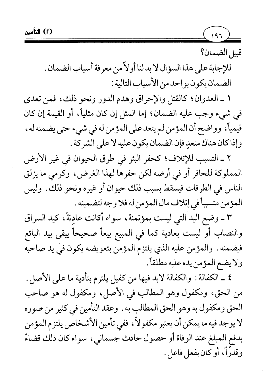 1 - العدوان؟ كالقتل والإحراق وهدم الدور ونحو ذلك، فمن تعدى في شيء وجب عليه الضمان؛ إما المثل إن كان مثليا، أو القيمة إن كان قيميا، وواضح أن المؤمن لم يتعد على المؤمن له في شيء حتى يضمنه له، وإذا كان هناك متعد فإن الضمان يكون عليه لا على الشركة.