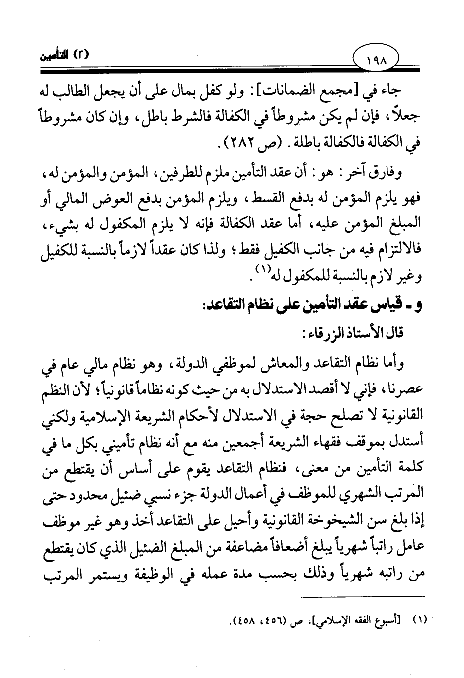 وأما نظام التقاعد والمعاش لموظفي الدولة، وهو نظام مالي عام في عصرنا، فإني لا أقصد الاستدلال به من حيث كونه نظاما قانونيا؛ لأن النظم القانونية لا تصلح حجة في الاستدلال لأحكام الشريعة الإسلامية ولكني أستدل بموقف فقهاء الشريعة أجمعين منه مع أنه نظام تأميني بكل ما في كلمة التأمين من معنى، فنظام التقاعد يقوم على أساس أن يقتطع من المرتب الشهري للموظف في أعمال الدولة جزء نسبي ضئيل محدود حتى إذا بلغ سن الشيخوخة القانونية وأحيل على التقاعد أخذ وهو غير موظف عامل راتبا شهريا يبلغ أضعافا مضاعفة من المبلغ الضئيل الذي كان يقتطع من راتبه شهريا وذلك بحسب مدة عمله في الوظيفة ويستمر المرتب