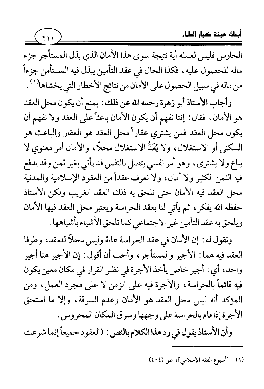 وأجاب الأستاذ أبو زهرة رحمه الله عن ذلك: بمنع أن يكون محل العقد هو الأمان، فقال: إننا نفهم أن يكون الأمان باعثا على العقد ولا نفهم أن يكون محل العقد فمن يشتري عقارا محل العقد هو العقار والباعث هو السكنى أو الاستغلال، ولا يعد الاستغلال محلا، والأمان أمر معنوي لا يباع ولا يشترى، وهو أمر نفسي يتصل بالنفس قد يأتي بغير ثمن وقد يدفع فيه الثمن الكثير ولا أمان، ولا نعرف عقدا من العقود الإسلامية والمدنية محل العقد فيه الأمان حتى نلحق به ذلك العقد الغريب ولكن الأستاذ حفظه الله يفكر، ثم يأتي لنا بعقد الحراسة ويعتبر محل العقد فيها الأمان ويلحق به عقد التأمين غير الاجتماعي كما تلحق الأشياء بأشباهها.