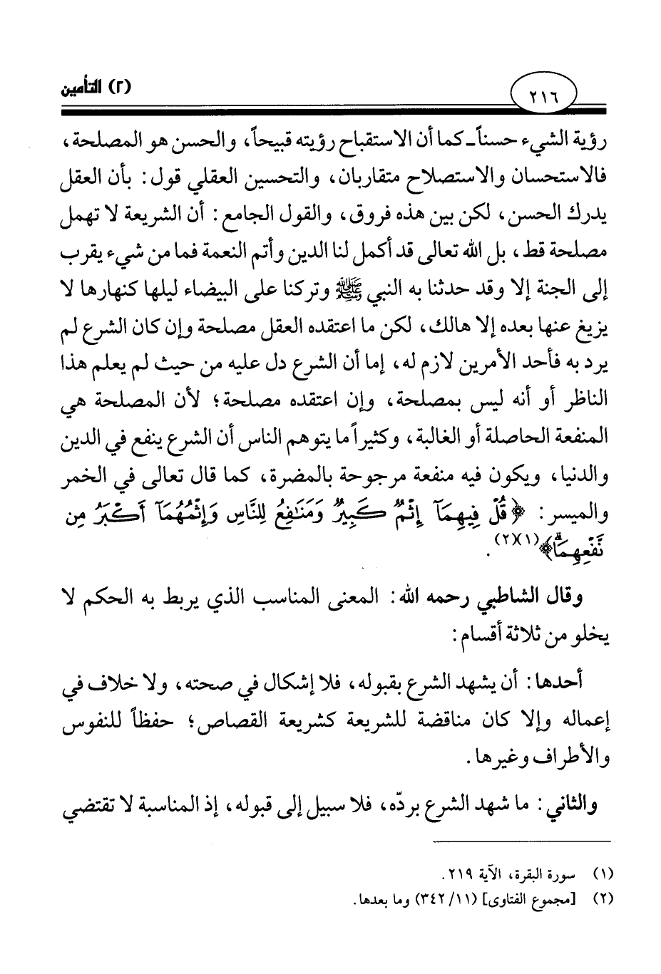 رؤية الشيء حسنا - كما أن الاستقباح رؤيته قبيحا، والحسن هو المصلحة، فالاستحسان والاستصلاح متقاربان، والتحسين العقلي قول: بأن العقل يدرك الحسن، لكن بين هذه فروق، والقول الجامع: أن الشريعة لا تهمل مصلحة قط، بل الله تعالى قد أكمل لنا الدين وأتم النعمة فما من شيء يقرب إلى الجنة إلا وقد حدثنا به النبي صلى الله عليه وسلم وتركنا على البيضاء ليلها كنهارها لا يزيغ عنها بعده إلا هالك، لكن ما اعتقده العقل مصلحة وإن كان الشرع لم يرد به فأحد الأمرين لازم له، إما أن الشرع دل عليه من حيث لم يعلم هذا الناظر أو أنه ليس بمصلحة، وإن اعتقده مصلحة؛ لأن المصلحة هي المنفعة الحاصلة أو الغالبة، وكثيرا ما يتوهم الناس أن الشرع ينفع في الدين والدنيا، ويكون فيه منفعة مرجوحة بالمضرة، كما قال تعالى في الخمر والميسر: {قُلْ فِيهِمَا إِثْمٌ كَبِيرٌ وَمَنَافِعُ لِلنَّاسِ وَإِثْمُهُمَا أَكْبَرُ مِنْ نَفْعِهِمَا} (¬1) (¬2) .