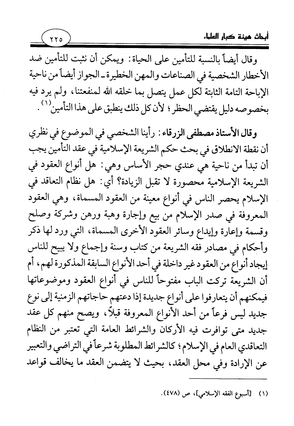 وقال الأستاذ مصطفى الزرقاء: رأينا الشخصي في الموضوع في نظري أن نقطة الانطلاق في بحث حكم الشريعة الإسلامية في عقد التأمين يجب أن تبدأ من ناحية هي عندي حجر الأساس وهي: هل أنواع العقود في الشريعة الإسلامية محصورة لا تقبل الزيادة؟ أي: هل نظام التعاقد في الإسلام يحصر الناس في أنواع معينة من العقود المسماة، وهي العقود المعروفة في صدر الإسلام من بيع وإجارة وهبة ورهن وشركة وصلح وقسمة وإعارة وإيداع وسائر العقود الأخرى المسماة، التي ورد لها ذكر وأحكام في مصادر فقه الشريعة من كتاب وسنة وإجماع ولا يبيح للناس إيجاد أنواع من العقود غير داخلة في أحد الأنواع السابقة المذكورة لهم، أم أن الشريعة تركت الباب مفتوحا للناس في أنواع العقود وموضوعاتها فيمكنهم أن يتعارفوا على أنواع جديدة إذا دعتهم حاجاتهم الزمنية إلى نوع جديد ليس فرعا من أحد الأنواع المعروفة قبلا، ويصح منهم كل عقد جديد متى توافرت فيه الأركان والشرائط العامة التي تعتبر من النظام التعاقدي العام في الإسلام؛ كالشرائط المطلوبة شرعا في التراضي والتعبير عن الإرادة وفي محل العقد، بحيث لا يتضمن العقد ما يخالف قواعد