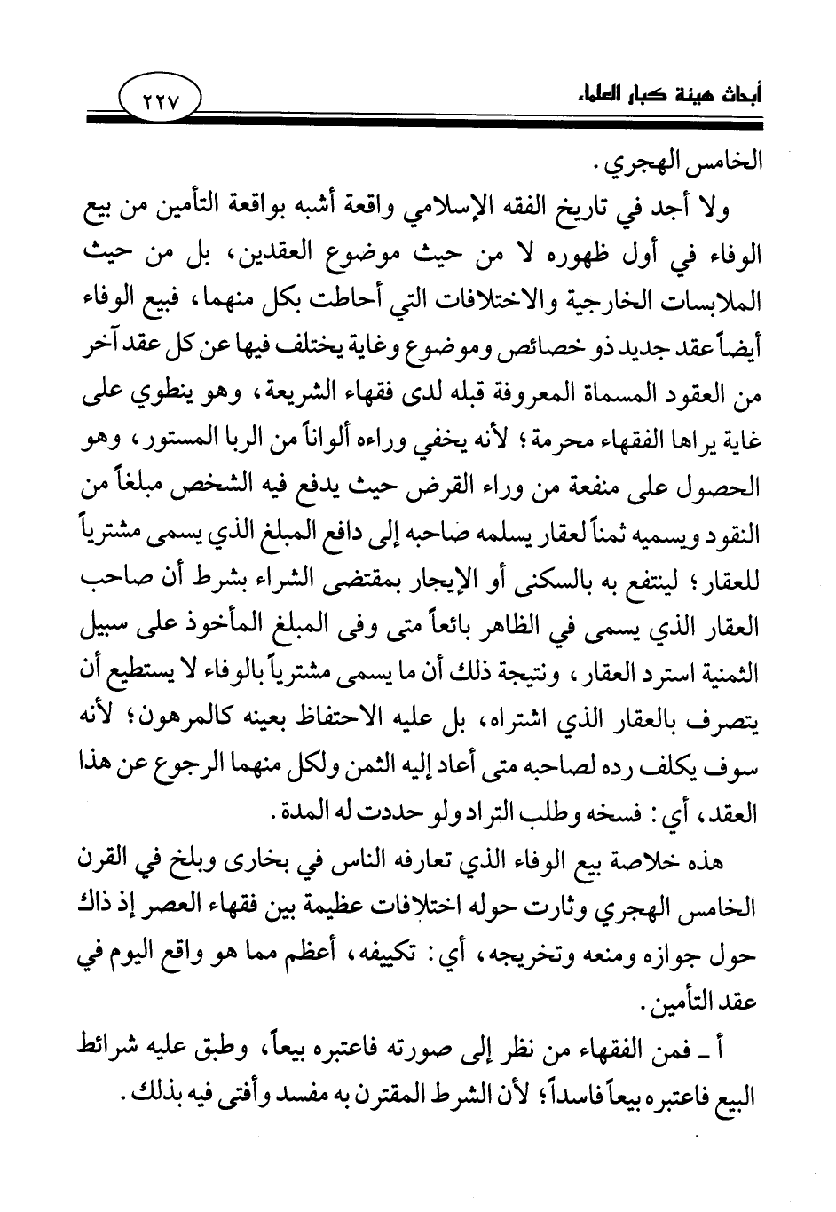 هذه خلاصة بيع الوفاء الذي تعارفه الناس في بخارى وبلخ في القرن الخامس الهجري وثارت حوله اختلافات عظيمة بين فقهاء العصر إذ ذاك حول جوازه ومنعه وتخريجه، أي: تكييفه، أعظم مما هو واقع اليوم في عقد التأمين.