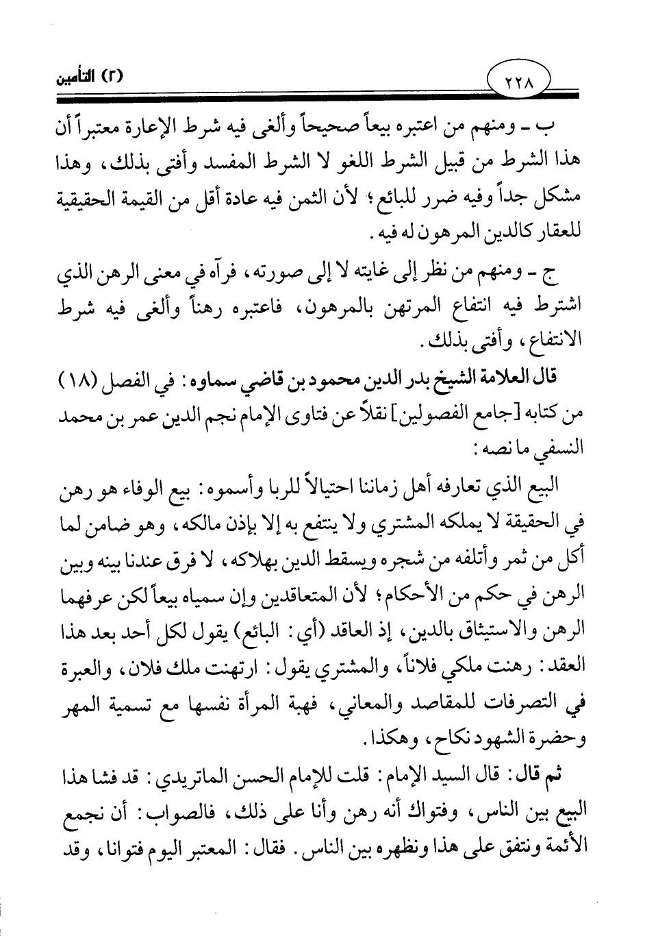 قال العلامة الشيخ بدر الدين محمود بن قاضي سماوه: في الفصل (18) من كتابه [جامع الفصولين] نقلا عن فتاوى الإمام نجم الدين عمر بن محمد النسفي ما نصه: