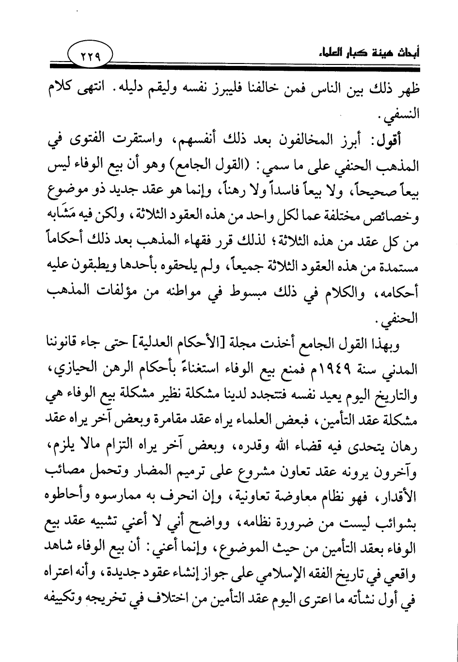 وبهذا القول الجامع أخذت مجلة [الأحكام العدلية] حتى جاء قانوننا المدني سنة 1949م فمنع بيع الوفاء استغناء بأحكام الرهن الحيازي، والتاريخ اليوم يعيد نفسه فتتجدد لدينا مشكلة نظير مشكلة بيع الوفاء هي مشكلة عقد التأمين، فبعض العلماء يراه عقد مقامرة وبعض آخر يراه عقد رهان يتحدى فيه قضاء الله وقدره، وبعض آخر يراه التزام ما لا يلزم، وآخرون يرونه عقد تعاون مشروع على ترميم المضار وتحمل مصائب الأقدار، فهو نظام معاوضة تعاونية، وإن انحرف به ممارسوه وأحاطوه بشوائب ليست من ضرورة نظامه، وواضح أني لا أعني تشبيه عقد بيع الوفاء بعقد التأمين من حيث الموضوع، وإنما أعني: أن بيع الوفاء شاهد واقعي في تاريخ الفقه الإسلامي على جواز إنشاء عقود جديدة، وأنه اعتراه في أول نشأته ما اعترى اليوم عقد التأمين من اختلاف في تخريجه وتكييفه