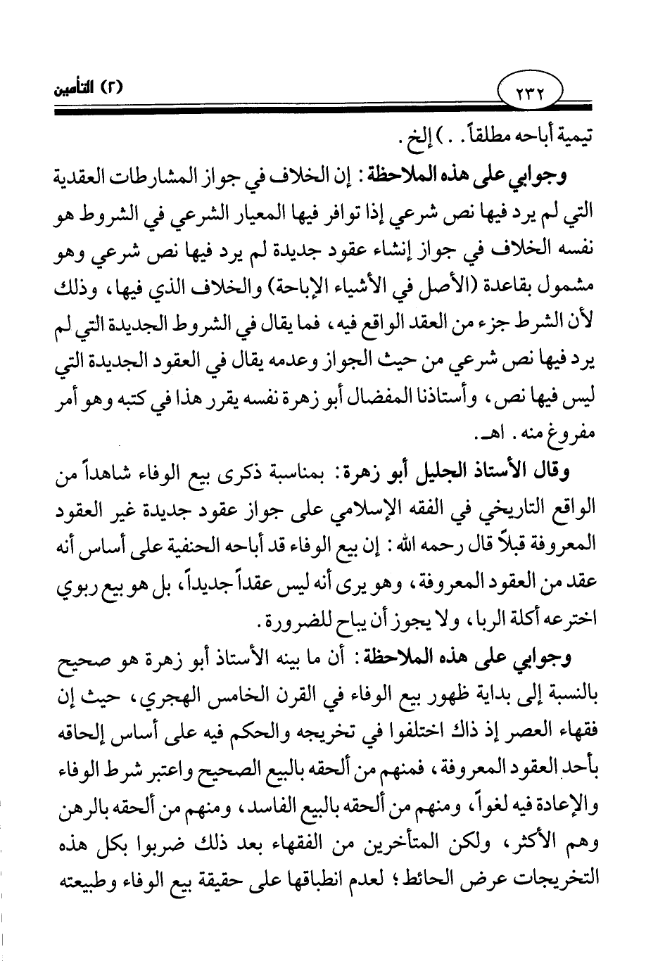 وجوابي على هذه الملاحظة: أن ما بينه الأستاذ أبو زهرة هو صحيح بالنسبة إلى بداية ظهور بيع الوفاء في القرن الخامس الهجري، حيث إن فقهاء العصر إذ ذاك اختلفوا في تخريجه والحكم فيه على أساس إلحاقه بأحد العقود المعروفة، فمنهم من ألحقه بالبيع الصحيح واعتبر شرط الوفاء والإعادة فيه لغوا، ومنهم من ألحقه بالبيع الفاسد، ومنهم من ألحقه بالرهن وهم الأكثر، ولكن المتأخرين من الفقهاء بعد ذلك ضربوا بكل هذه التخريجات عرض الحائط؛ لعدم انطباقها على حقيقة بيع الوفاء وطبيعته