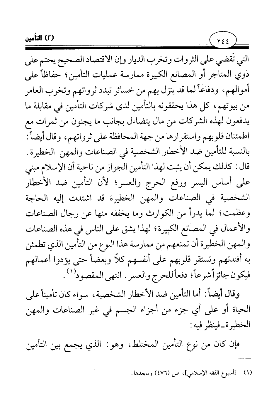 التي تقضي على الثروات وتخرب الديار وإن الاقتصاد الصحيح يحتم على ذوي المتاجر أو المصانع الكبيرة ممارسة عمليات التأمين؛ حفاظا على أموالهم، ودفاعا لما قد ينزل بهم من خسائر تبدد ثرواتهم وتخرب العامر من بيوتهم، كل هذا يحققونه بالتأمين لدى شركات التأمين في مقابلة ما يدفعون لهذه الشركات من مال يتضاءل بجانب ما يجنون من ثمرات مع اطمئنان قلوبهم واستقرارها من جهة المحافظة على ثرواتهم، وقال أيضا: بالنسبة للتأمين ضد الأخطار الشخصية في الصناعات والمهن الخطيرة. قال: كذلك يمكن أن يثبت لهذا التأمين الجواز من ناحية أن الإسلام مبني على أساس اليسر ورفع الحرج والعسر؛ لأن التأمين ضد الأخطار الشخصية في الصناعات والمهن الخطيرة قد اشتدت إليه الحاجة وعظمت؛ لما يدرأ من الكوارث وما يخففه منها عن رجال الصناعات والأعمال في المصانع الكبيرة؛ لهذا يشق على الناس في هذه الصناعات والمهن الخطيرة أن تمنعهم من ممارسة هذا النوع من التأمين الذي تطمئن به أفئدتهم وتستقر قلوبهم على أنفسهم كلا وبعضا حتى يؤدوا أعمالهم فيكون جائزا شرعا؛ دفعا للحرج والعسر. انتهى المقصود (¬1) .