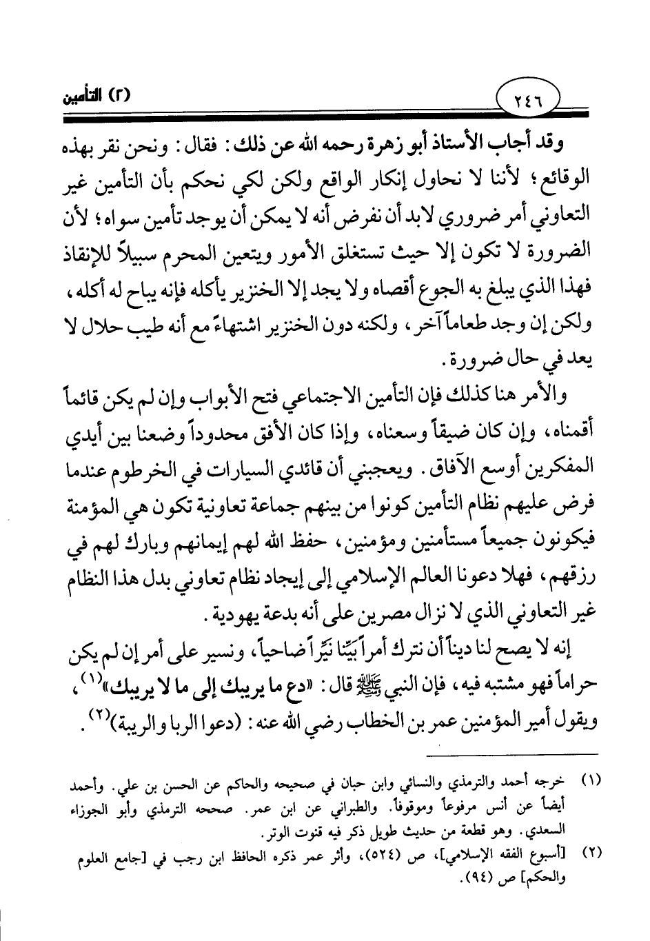 إنه لا يصح لنا دينا أن نترك أمرا بينا نيرا ضاحيا، ونسير على أمر إن لم يكن حراما فهو مشتبه فيه، فإن النبي صلى الله عليه وسلم قال: «دع ما يريبك إلى ما لا يريبك (¬1) » ، ويقول أمير المؤمنين عمر بن الخطاب رضي الله عنه: (دعوا الربا والريبة) .