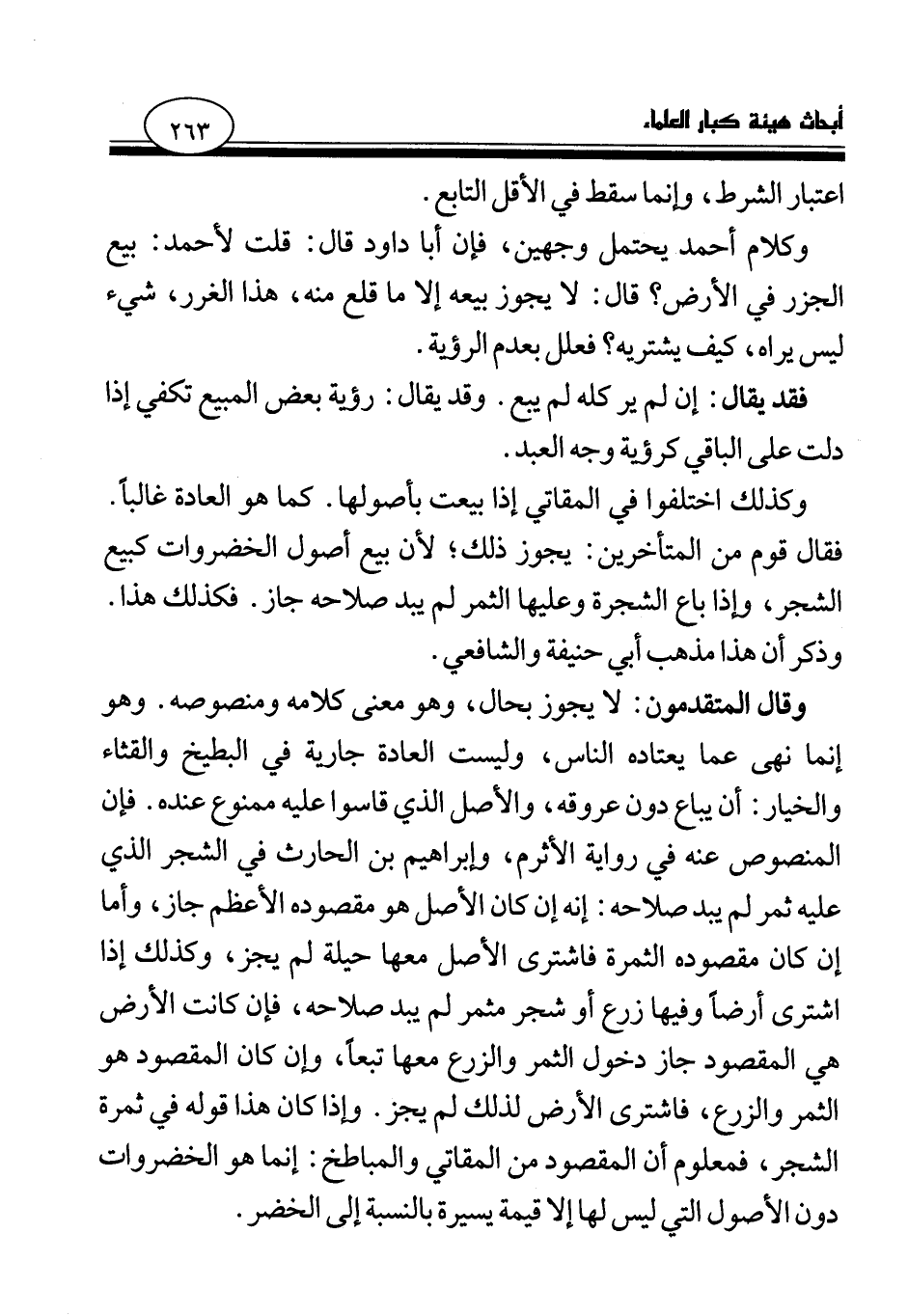 وقال المتقدمون: لا يجوز بحال، وهو معنى كلامه ومنصوصه. وهو إنما نهى عما يعتاده الناس، وليست العادة جارية في البطيخ والقثاء والخيار: أن يباع دون عروقه، والأصل الذي قاسوا عليه ممنوع عنده. فإن المنصوص عنه في رواية الأثرم، وإبراهيم بن الحارث في الشجر الذي عليه ثمر لم يبد صلاحه: إنه إن كان الأصل هو مقصوده الأعظم جاز، وأما إن كان مقصوده الثمرة فاشترى الأصل معها حيلة لم يجز، وكذلك إذا اشترى أرضا وفيها زرع أو شجر مثمر لم يبد صلاحه، فإن كانت الأرض هي المقصود جاز دخول الثمر والزرع معها تبعا، وإن كان المقصود هو الثمر والزرع، فاشترى الأرض لذلك لم يجز. وإذا كان هذا قوله في ثمرة الشجر، فمعلوم أن المقصود من المقاتي والمباطخ: إنما هو الخضروات دون الأصول التي ليس لها إلا قيمة يسيرة بالنسبة إلى الخضر.