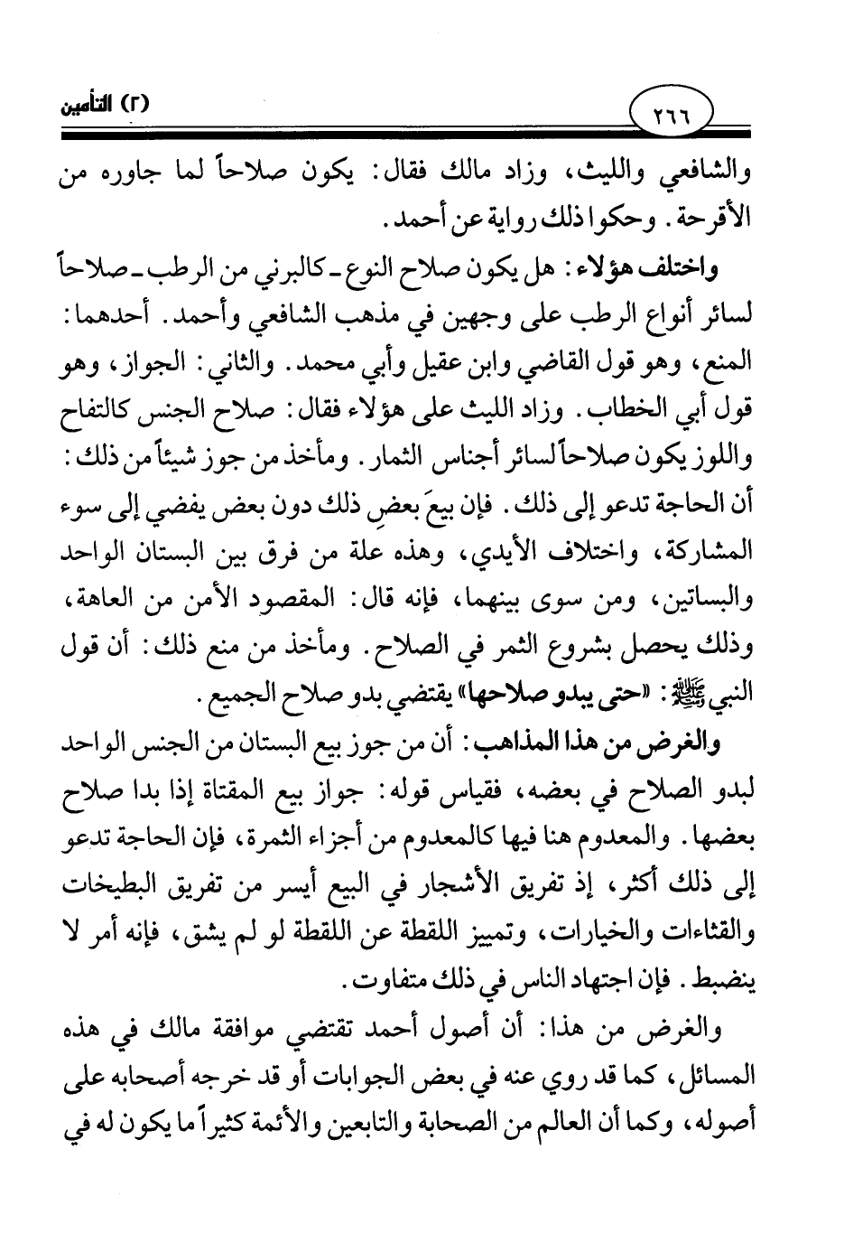 واختلف هؤلاء: هل يكون صلاح النوع - كالبرني من الرطب - صلاحا لسائر أنواع الرطب على وجهين في مذهب الشافعي وأحمد. أحدهما: المنع، وهو قول القاضي وابن عقيل وأبي محمد. والثاني: الجواز، وهو قول أبي الخطاب. وزاد الليث على هؤلاء فقال: صلاح الجنس كالتفاح واللوز يكون صلاحا لسائر أجناس الثمار. ومأخذ من جوز شيئا من ذلك: أن الحاجة تدعو إلى ذلك. فإن بيع بعض ذلك دون بعض يفضي إلى سوء المشاركة، واختلاف الأيدي، وهذه علة من فرق بين البستان الواحد والبساتين، ومن سوى بينهما، فإنه قال: المقصود الأمن من العاهة، وذلك يحصل بشروع الثمر في الصلاح. ومأخذ من منع ذلك: أن قول النبي صلى الله عليه وسلم: «حتى يبدو صلاحها (¬1) » يقتضي بدو صلاح الجميع.