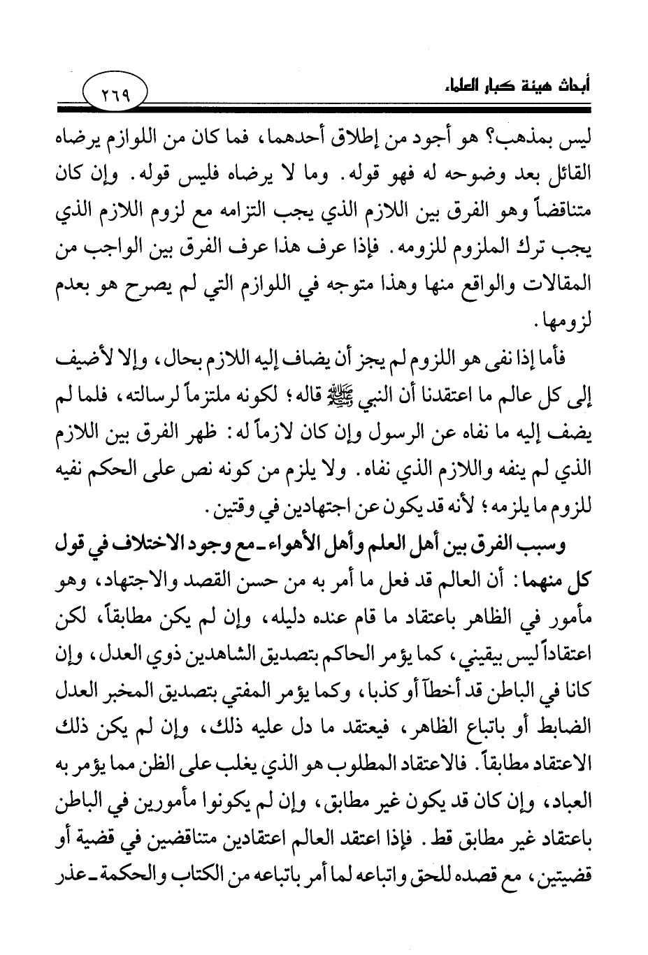 وسبب الفرق بين أهل العلم وأهل الأهواء - مع وجود الاختلاف في قول كل منهما: أن العالم قد فعل ما أمر به من حسن القصد والاجتهاد، وهو مأمور في الظاهر باعتقاد ما قام عنده دليله، وإن لم يكن مطابقا، لكن اعتقادا ليس بيقيني، كما يؤمر الحاكم بتصديق الشاهدين ذوي العدل، وإن كانا في الباطن قد أخطأ أو كذبا، وكما يؤمر المفتي بتصديق المخبر العدل الضابط أو باتباع الظاهر، فيعتقد ما دل عليه ذلك، وإن لم يكن ذلك الاعتقاد مطابقا. فالاعتقاد المطلوب هو الذي يغلب على الظن مما يؤمر به العباد، وإن كان قد يكون غير مطابق، وإن لم يكونوا مأمورين في الباطن باعتقاد غير مطابق قط. فإذا اعتقد العالم اعتقادين متناقضين في قضية أو قضيتين، مع قصده للحق واتباعه لما أمر باتباعه من الكتاب والحكمة - عذر