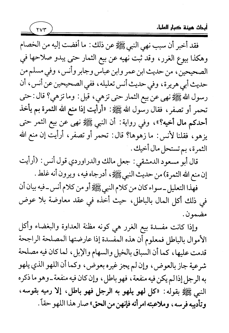 فقد أخبر أن سبب نهي النبي صلى الله عليه وسلم عن ذلك: ما أفضت إليه من الخصام وهكذا بيوع الغرر، وقد ثبت نهيه عن بيع الثمار حتى يبدو صلاحها في الصحيحين، من حديث ابن عمر وابن عباس وجابر وأنس، وفي مسلم من حديث أبي هريرة، وفي حديث أنس تعليله، ففي الصحيحين عن أنس «أن رسول الله صلى الله عليه وسلم نهى عن بيع الثمار حتى تزهي، قيل: وما تزهي؟ قال: حتى تحمر أو تصفر، فقال رسول الله صلى الله عليه وسلم: أرأيت إذا منع الله الثمرة بم يأخذ أحدكم مال أخيه؟ (¬1) » ، وفي رواية: أن النبي صلى الله عليه وسلم «نهى عن بيع الثمر حتى يزهو، فقلنا لأنس: ما زهوها؟ قال: تحمر أو تصفر، أرأيت إن منع الله الثمرة، بم تستحل مال أخيك (¬2) » .