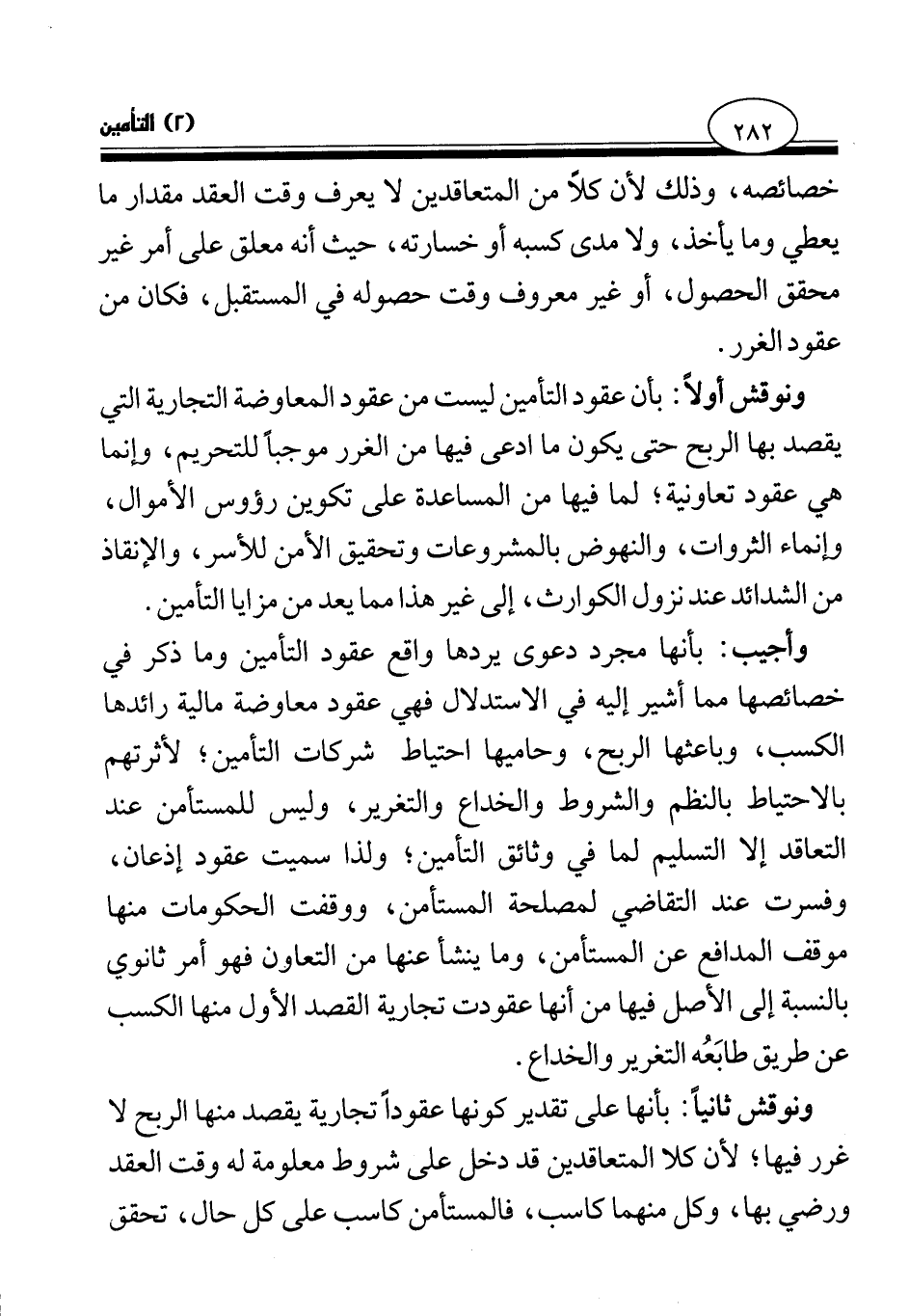 ونوقش أولا: بأن عقود التأمين ليست من عقود المعاوضة التجارية التي يقصد بها الربح حتى يكون ما ادعى فيها من الغرر موجبا للتحريم، وإنما هي عقود تعاونية؛ لما فيها من المساعدة على تكوين رءوس الأموال، وإنماء الثروات، والنهوض بالمشروعات وتحقيق الأمن للأسر، والإنقاذ من الشدائد عند نزول الكوارث، إلى غير هذا مما يعد من مزايا التأمين.